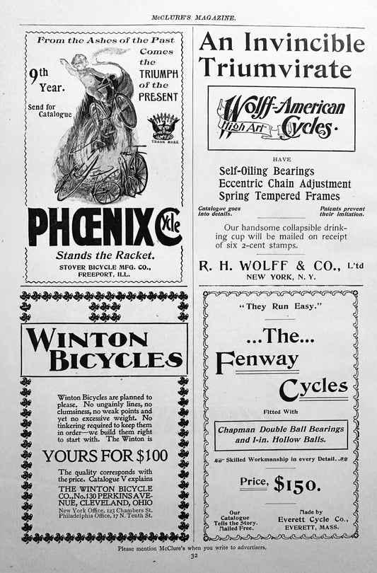 1897 Antique Bicycle Ephemera Stearns Yellow Fellow, Wolff, Fenway ++ Ad #N1280