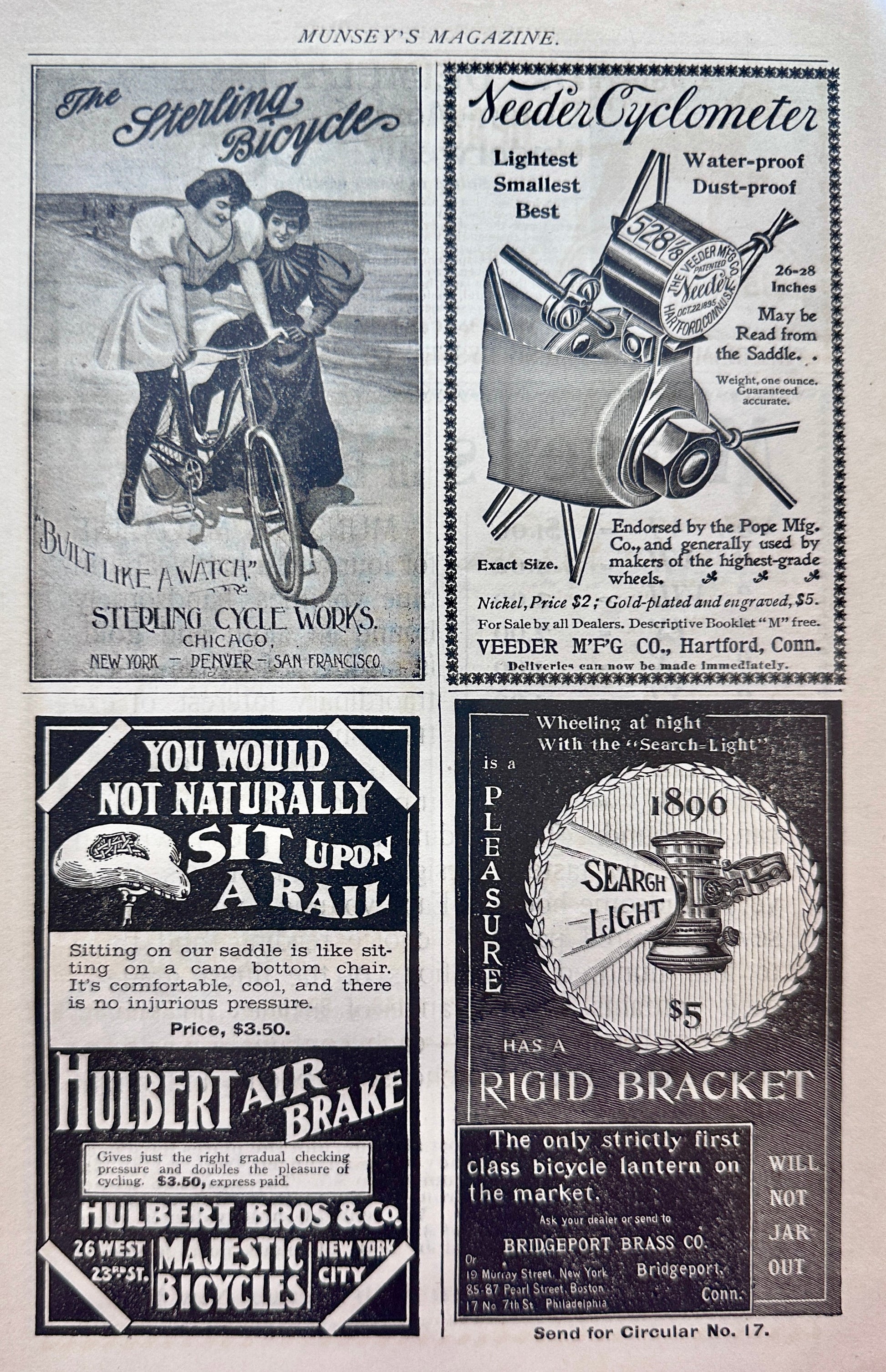 This original 6 x 9" magazine page from Munsey's Magazine of 1896 features no less than 7 Bicycle related advertisements front an back. These Include Windsor Bicycles, Syracuse Bicycle, WC Baker Tricycle, Dean No-Puncture Bicycle Tires, Veeder Cyclometer and Sterling Cycle Works. A great combination of ads for the antique bicycle lover!