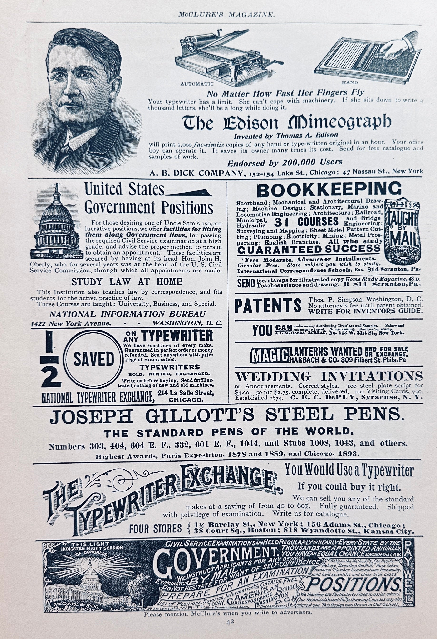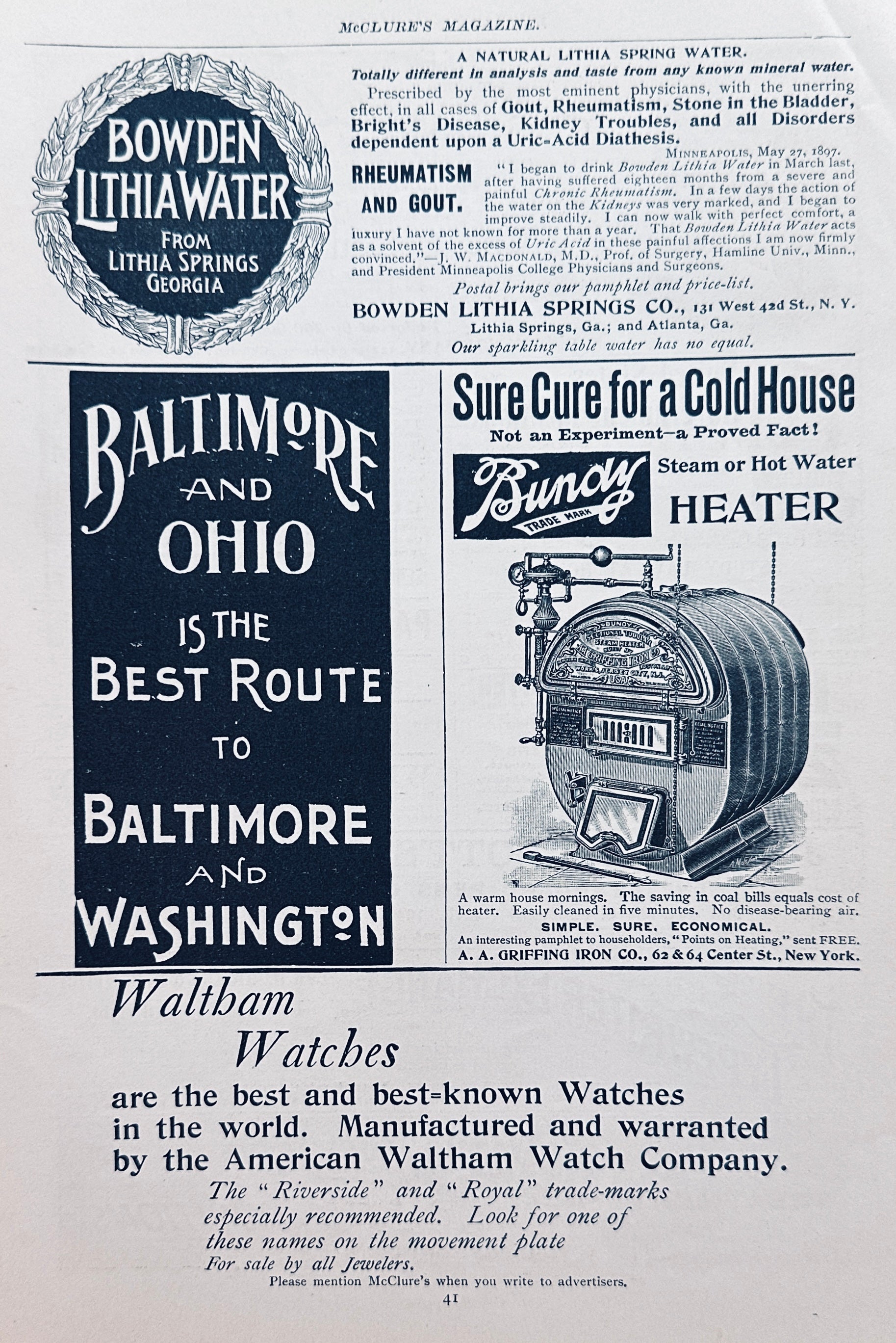 This original advertising page was published in 1897 in the McClure's Magazine and features 15 advertisements front and back. Some of the notable ones include the Edison Mimeograph for making copies of typed letters, Joseph Gillott's Steel Pens, Bowden Lithia Water for Lithia Springs, GA, Baltimore & Ohio Route and Waltham Watches.