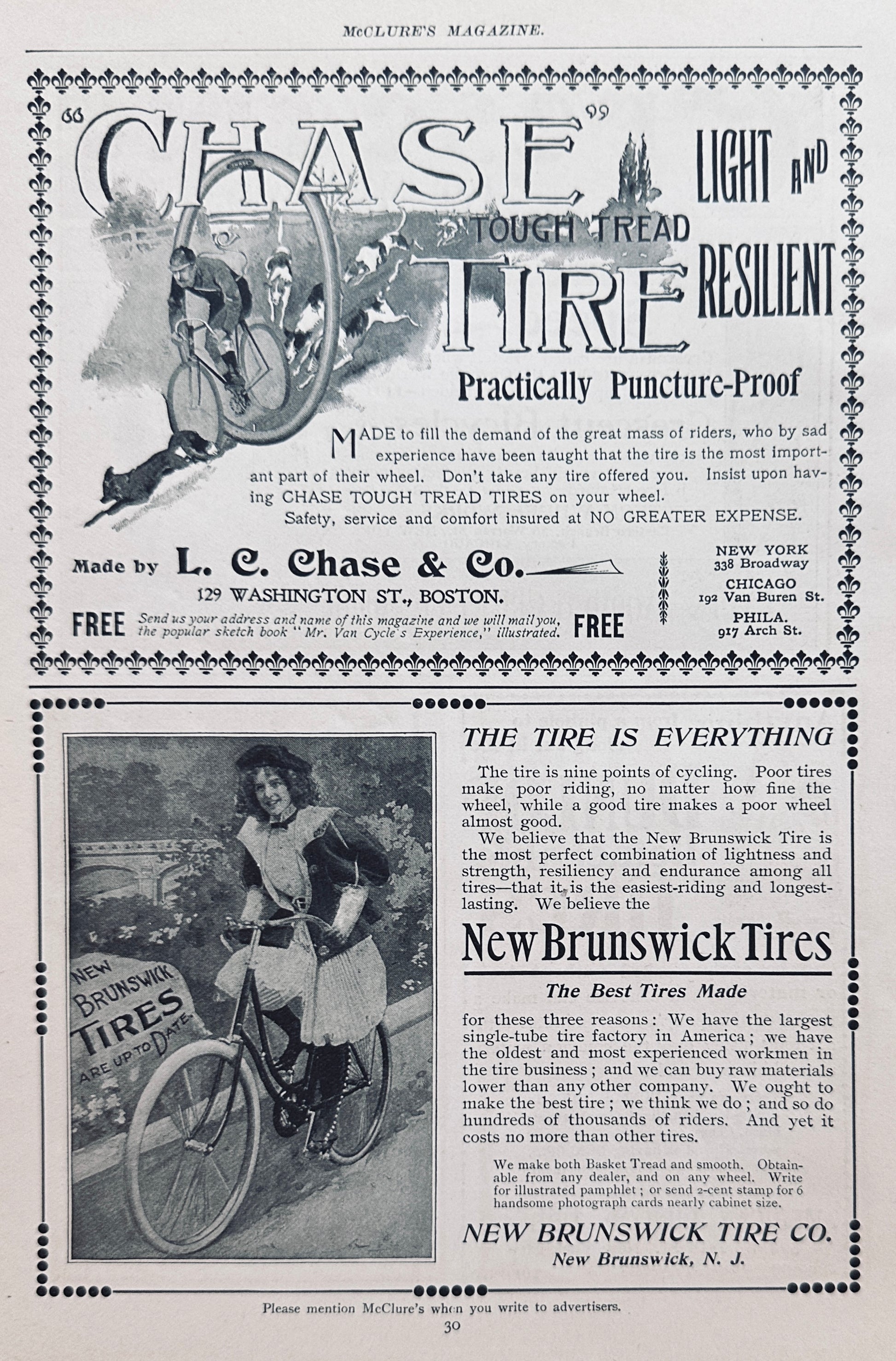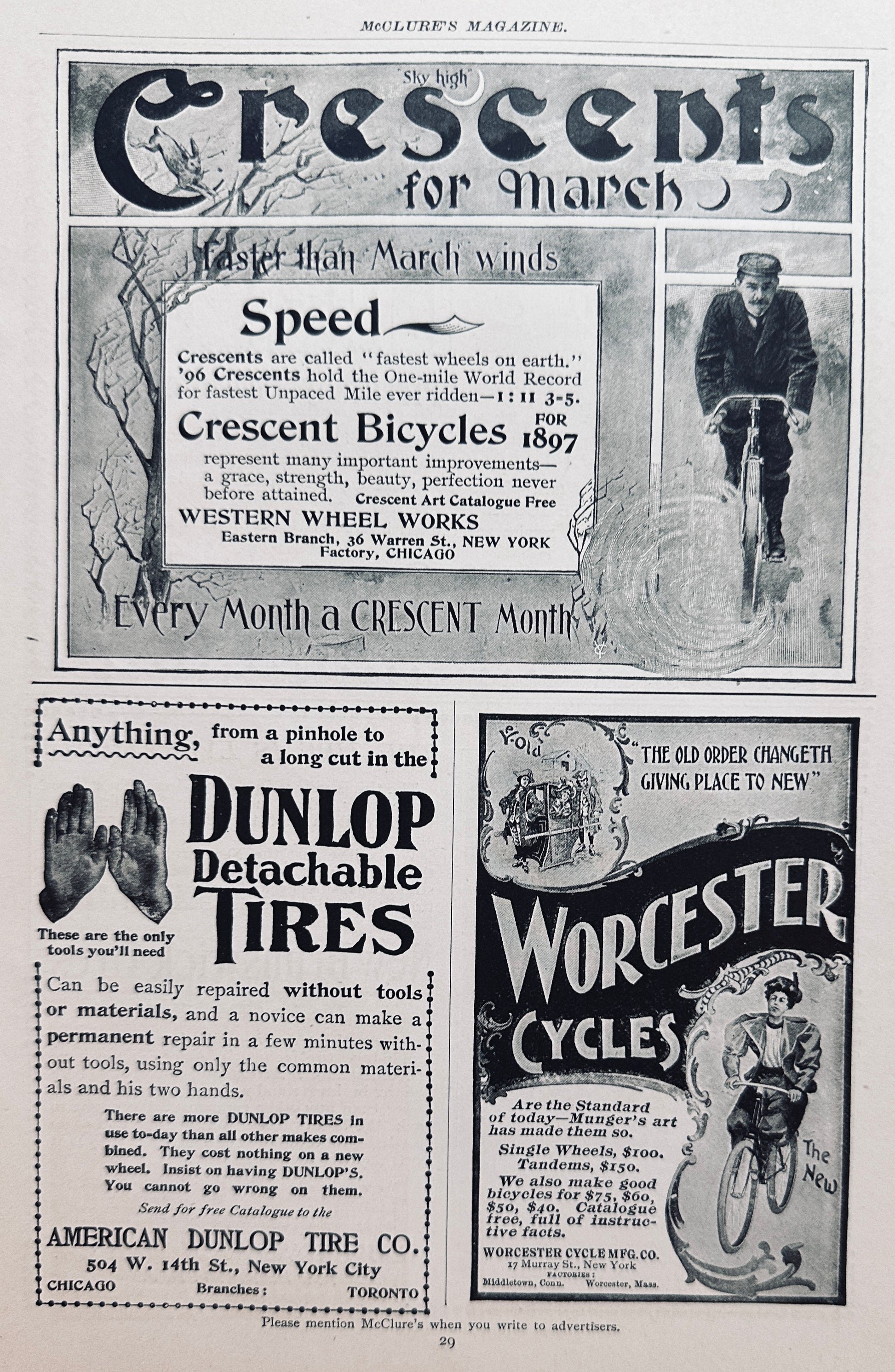 This original 7 x 10" magazine page from 1897 McClures features Bicycle and Bicycle accessories front and back. A total of 5 different manufacturers are represented. Names include Crescent, Dunlop, Worcester Cycles, Chase Tire and New Brunswick Tires.
