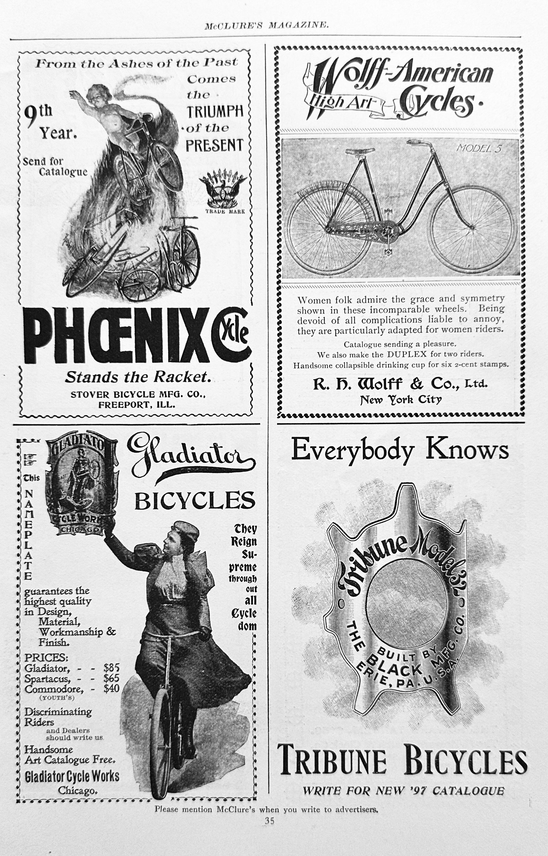 This original 7 x 10 " magazine advertising page dates from 1897 and features 8 unique Antique Bicycle Ads 4 on each side, all are # 2 x 4" in size. Names include Phoenix Cycle by Stove Bicycle Mfg., Co. Wolff American High Art Cycles of New York City, Gladiator Bicycles our of Chicago, Tribune Bicycles Model 32, Eire, PA. Royal Worcester Cycles, Gales Bicycles, Howard Cycle co & Creepy Clown Ben-Hur Bicycles out of Indianapolis.