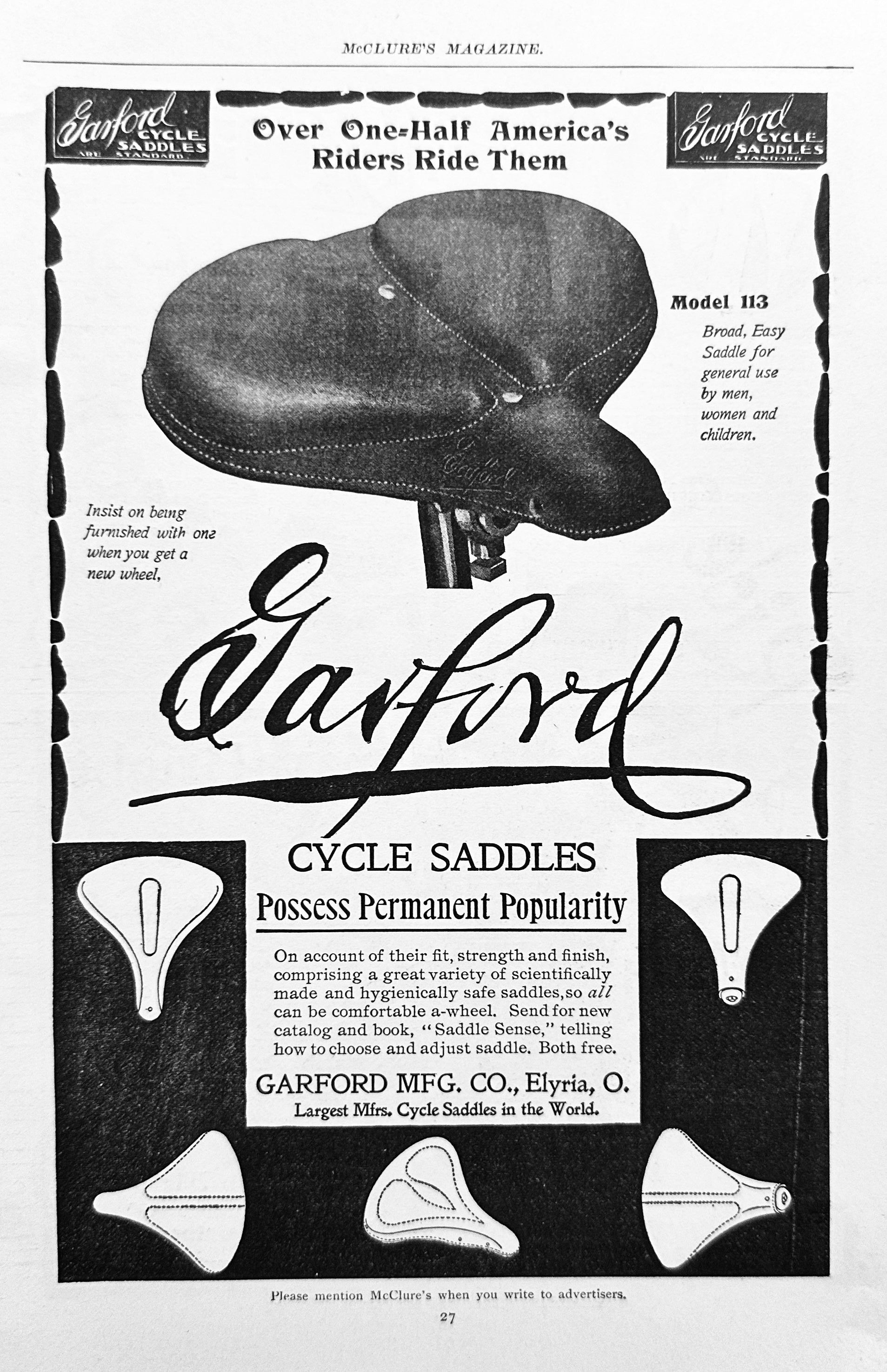 This original 7 x 10" magazine ad features Antique Bicycle Ephemera Ads from 1897. On one side are ads for Two Unique brands of Bicycle Lamps - Matthews & Willard and Bridgeport Brass. On the reverse is a full page ad for Garford Cycle Saddles as made in Elyria Ohio in that time period.