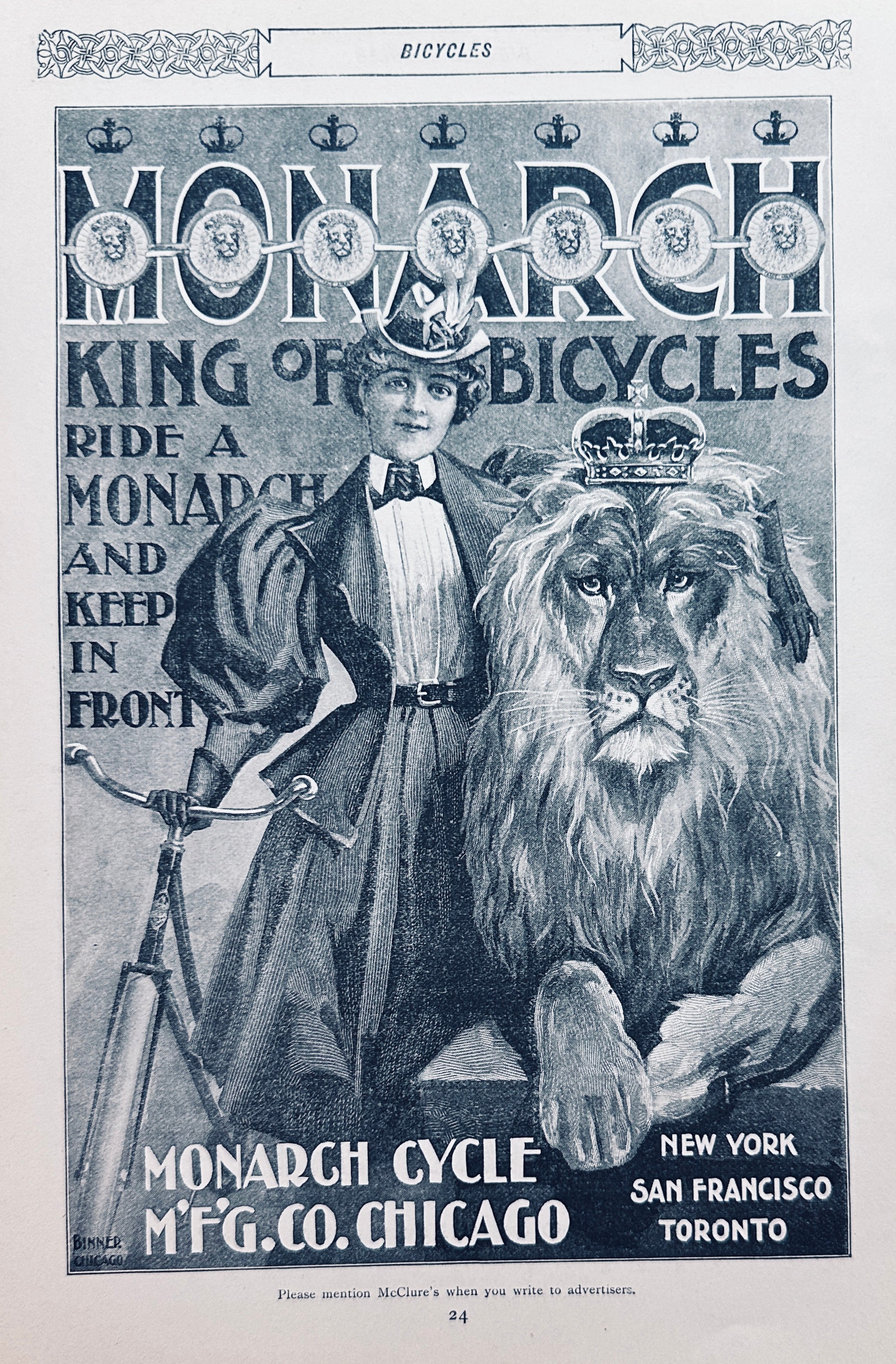 This full page 7 x 10" original Antique Bicycles ad from 1897 features the Monarch Bicycle as the King of Bicycles.
