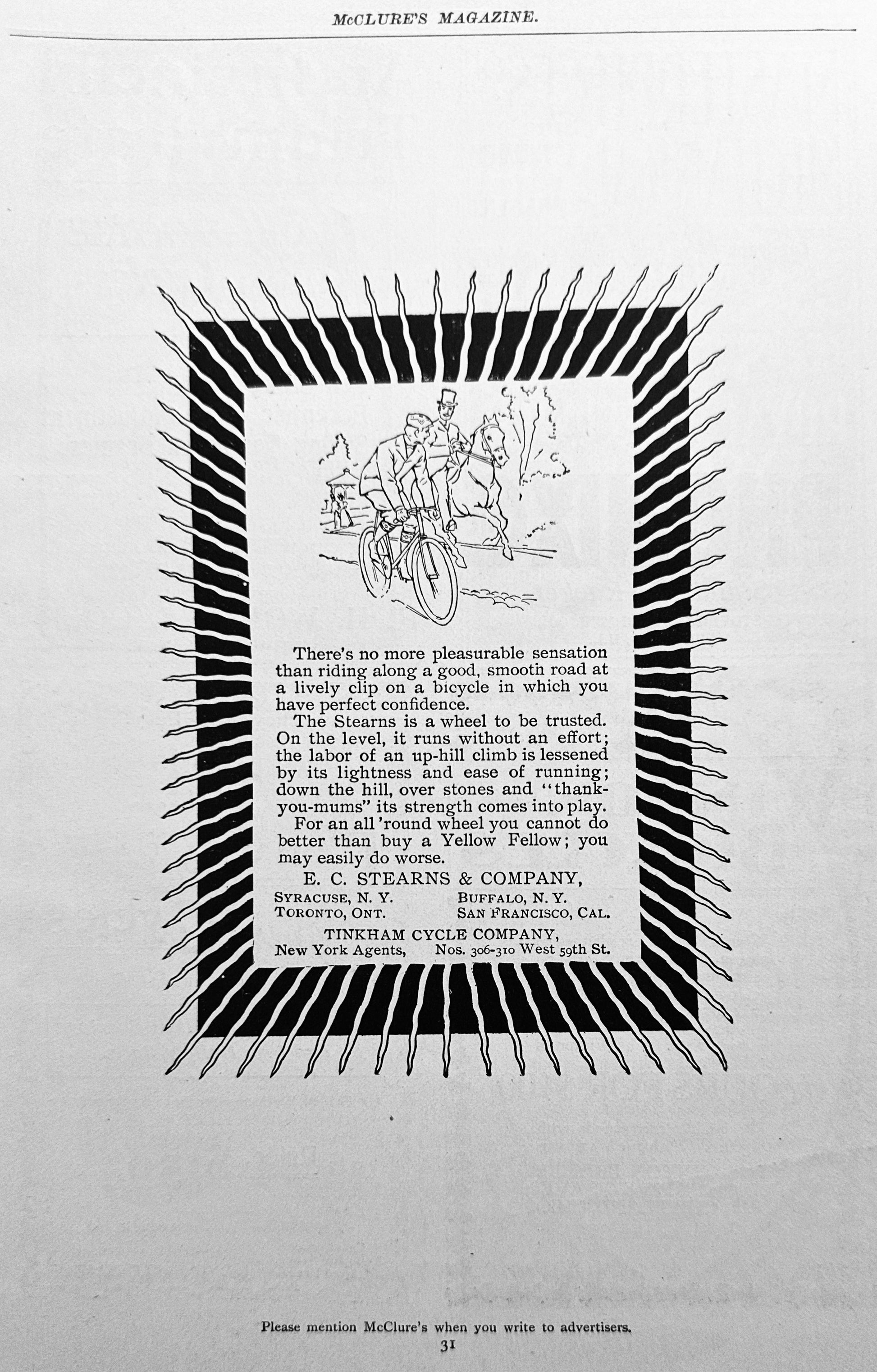 This original 7 x 10" magazine ad from McClures magazine of 1897 features 5 different Bicycle Manufacturers of 1897. On the front is a full page ad for the Stearns "Yellow Fellow" while on the reverse there are 4 more unique vendor ads. Manufacturers represented include Stover Bicycle of Freeport, IL, Wolff of New York, Winton Bicycles of Cleveland, Oh anbd Fenway Cycles our of Everett Cycle in Everett, MA.
