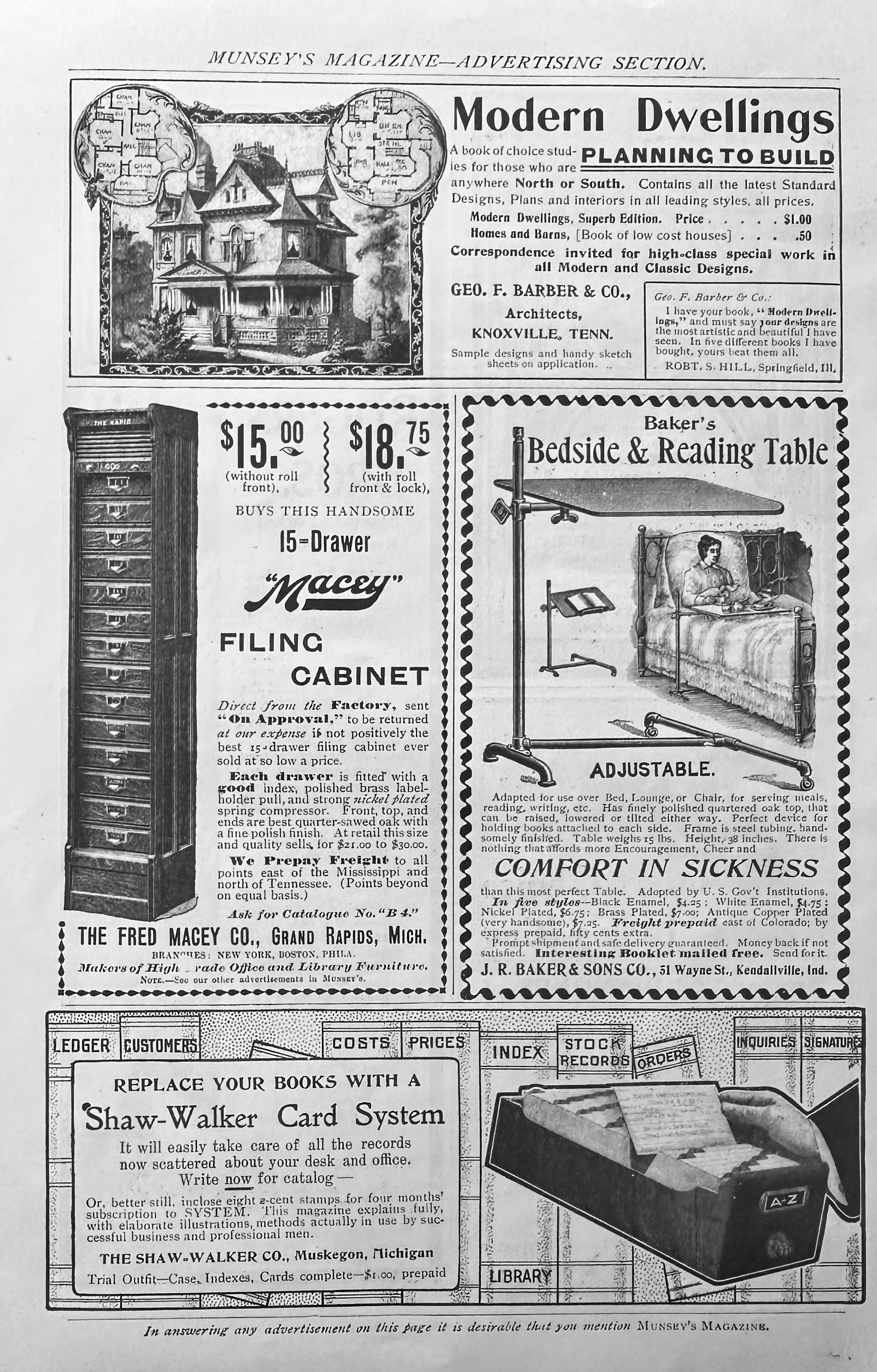 This original 7 x 9" magazine page dates from 1901 and contains 7 ads front and back. Only one side of the page is shown. This side features House Plans from Knoxville, TN architects George F. Barber & Co as well as a very unique Tall Filing cabinet with a roll top closure to match the Roll-Top Desks this Grand Rapids Company was known for in this period.