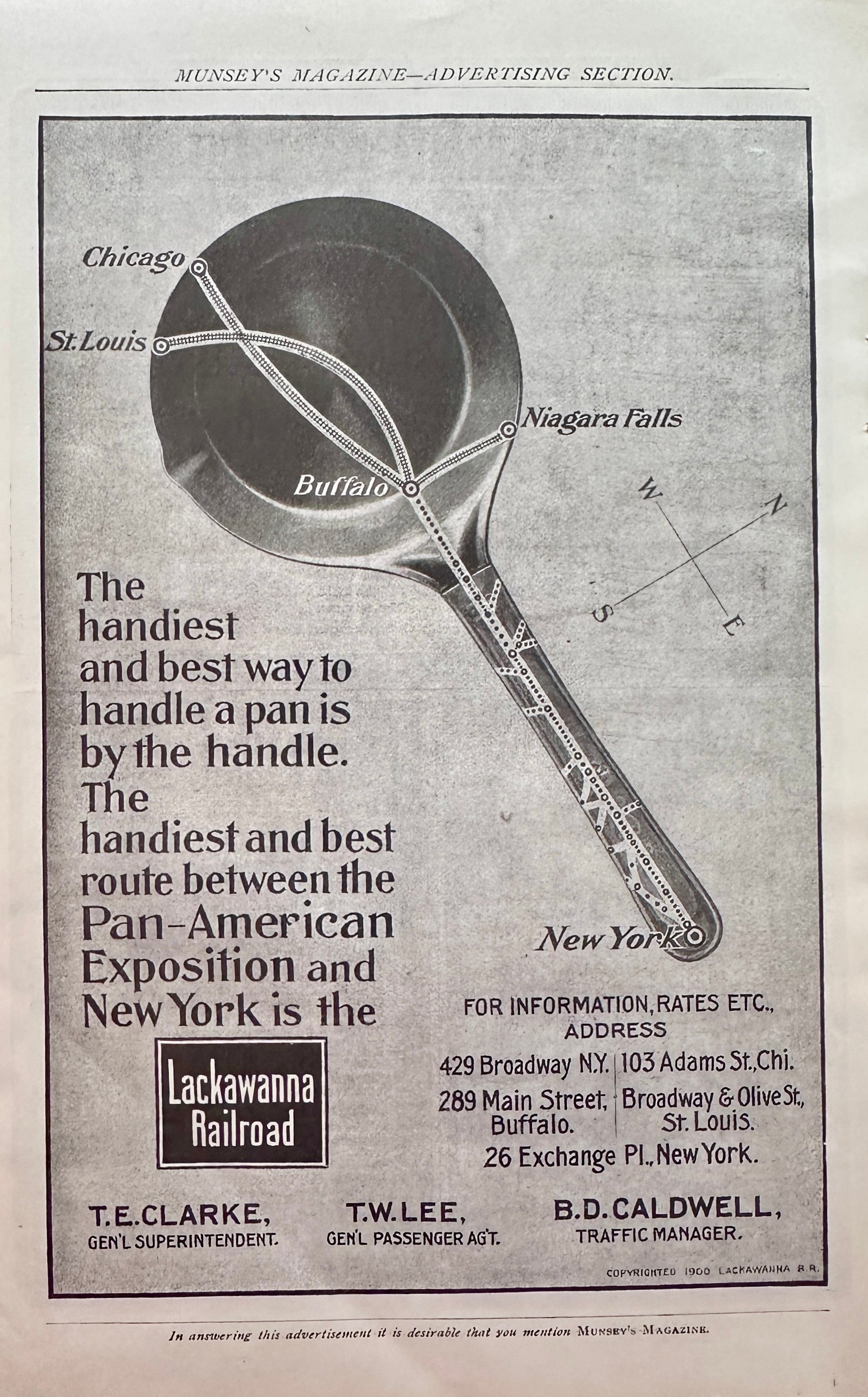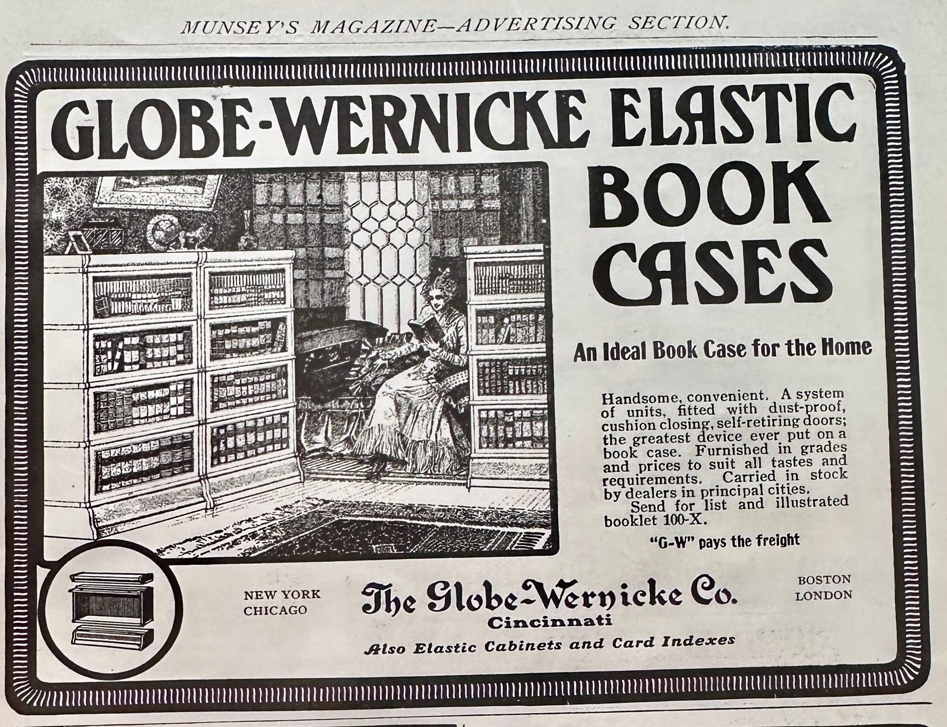 This original 7 x 10" magazine ad showcases the freight routes of the Lackawanna railroad between New York and Chicago- St. Louis in 1901. The reverse side features an @ 4 x6" ad for the Globe Wernicke Elastic Book Cases popular during that period and highly collectible today.