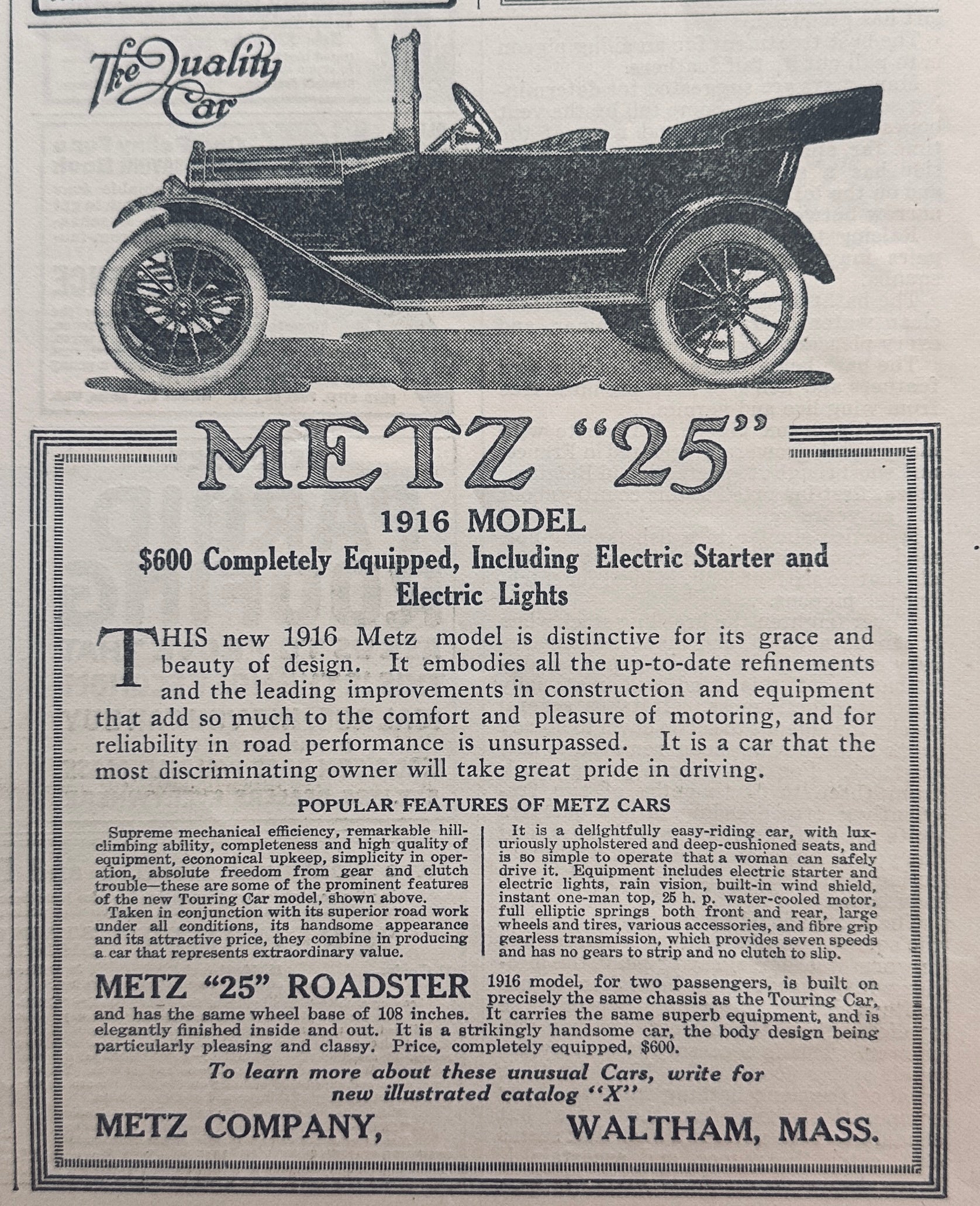 This original 5 x 6", 1915 magazine ad, is untrimmed from its larger 8 x 12" page and features the Metz 1916 model made in Waltham, Massachusetts.