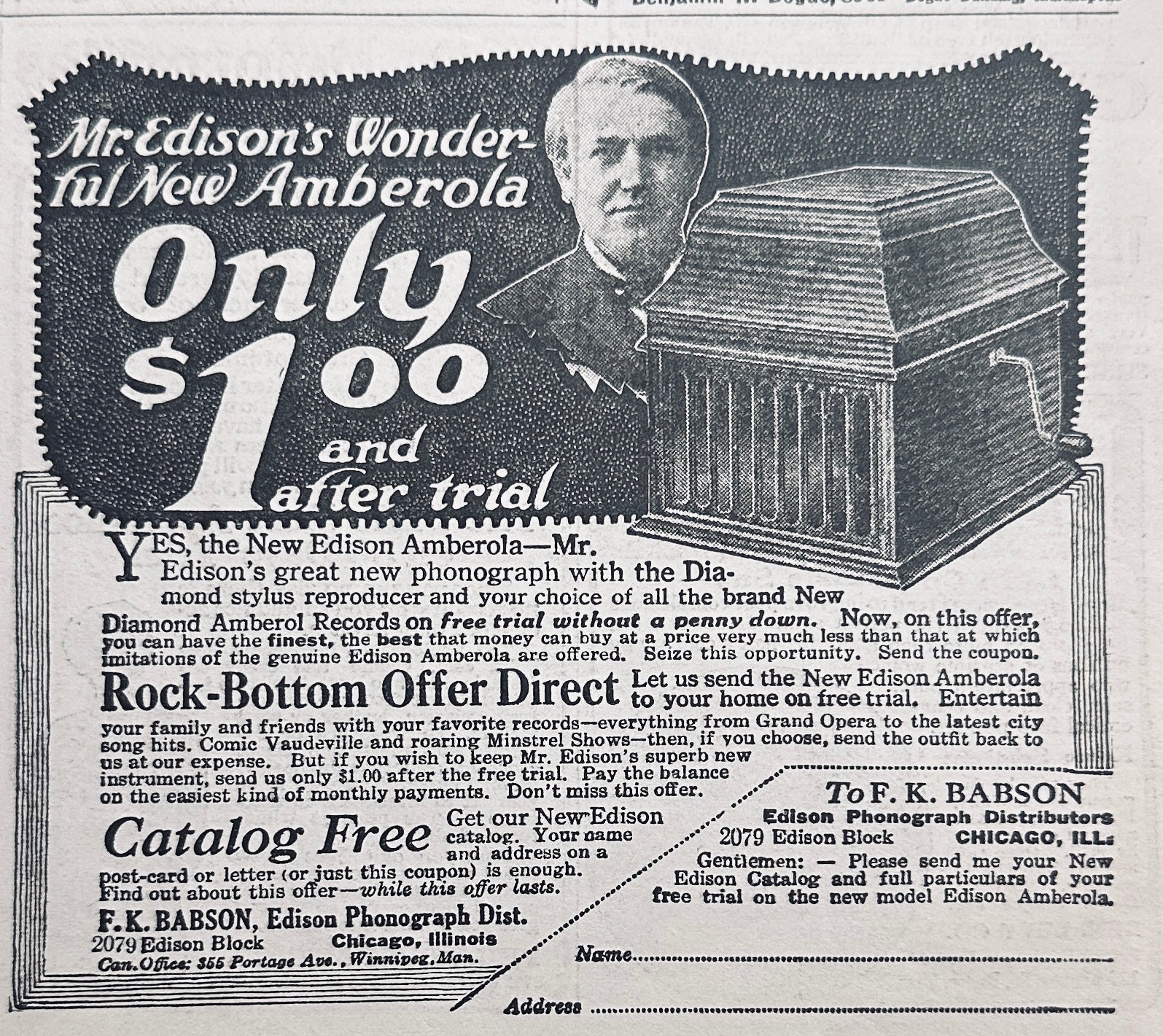 This original 3 x 4" magazine ad has been partially trimmed and features the Edison Amberola Table Top Phonograph for just a $ 1 after your free trail period.
