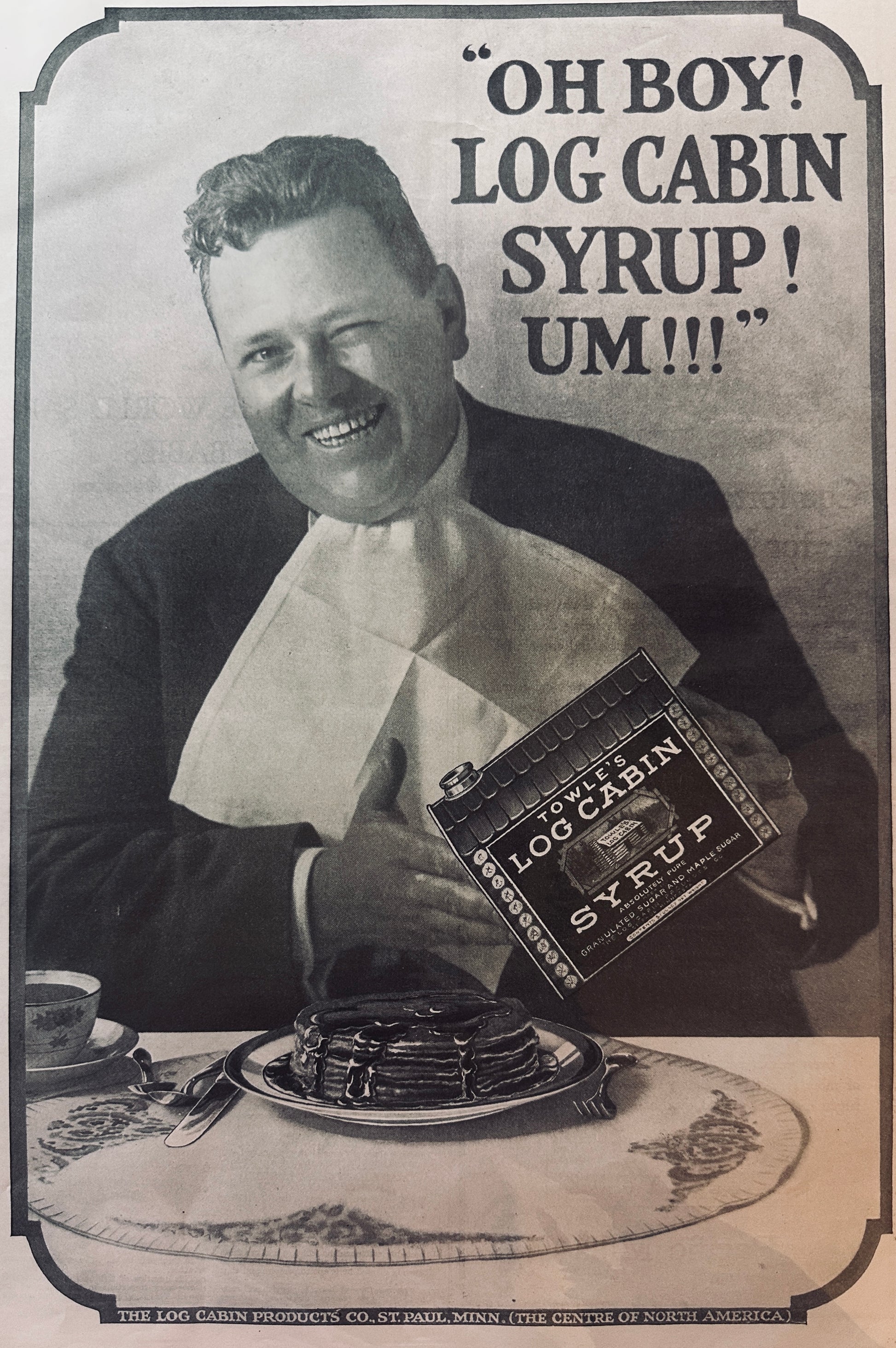 This original Masterpiece Ad of Yesteryear showcase Towle's Log Cabin Syrup which was produce in 1919 in St. Paul, Minnesota, was maple flavor and came in a Log Cabin shaped Tin.