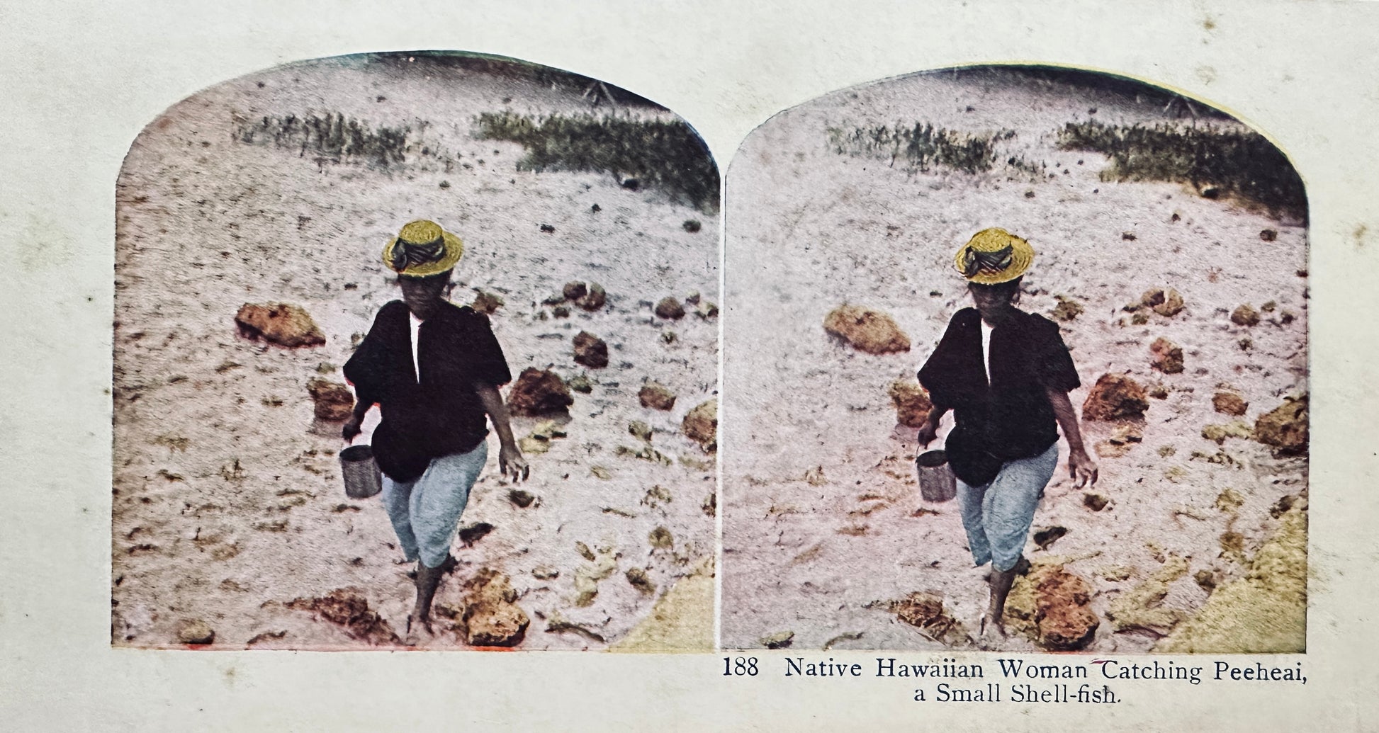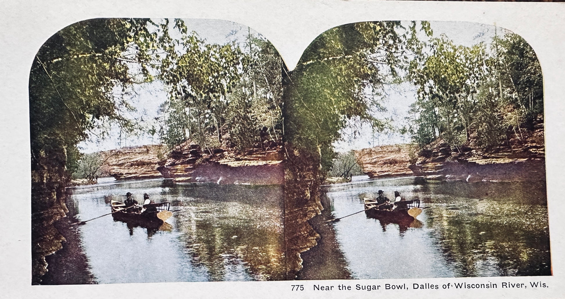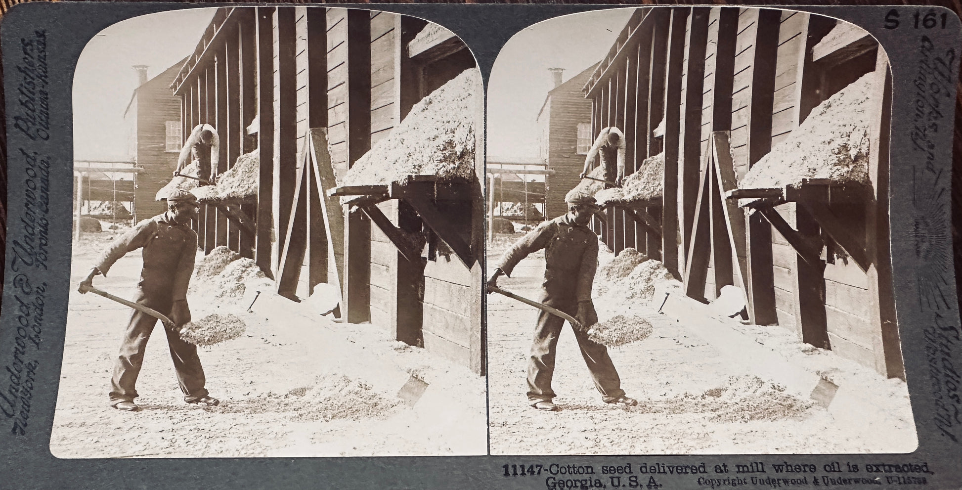 Lot of (4) Stereoscope cabinet cards from 1910-1919 timeframe (?) featuring various subject matter. The first card has image 187 Bamboo as it grows in Manila on one side, and Image 188 Native Hawaiian Woman catching Peeheai a small shell-fish on the reverse. The second card is image 775 "Near the Sugar Bowl, Dalles of Wisconsin River, WI, with an unmarked backside. The third card was used as a Holiday Greeting card, shows images of palm trees on the front and address of the business sending on the reverse. The 4th card shows a worker shoveling cotton seed at a mill in Georgia on the front and a lengthy explanation on the reverse.