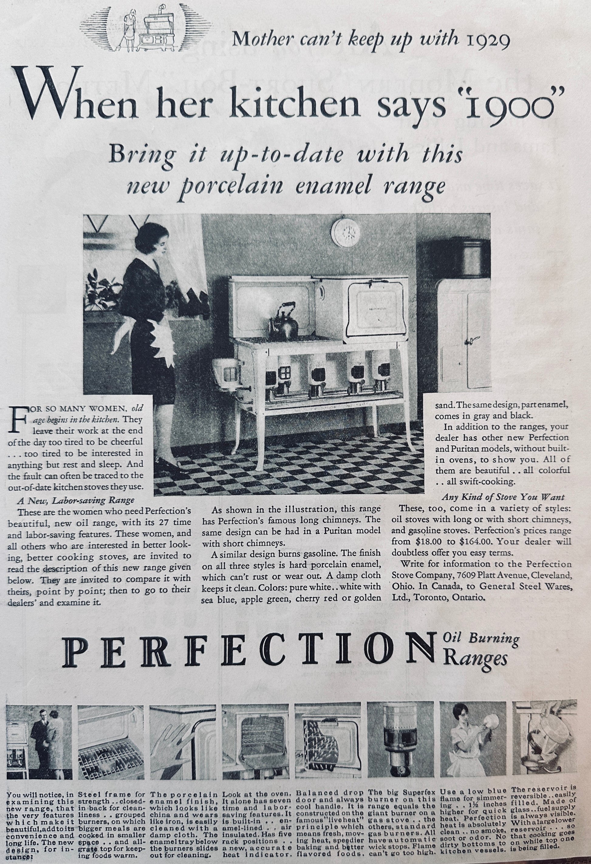 This original 8.5 x 11" magazine ad from 1929 showcases the Modern 1929 American Kitchen equipped with the Perfection Porcelain Enamel Range. Classic styling and throwback to a nostalgic period.