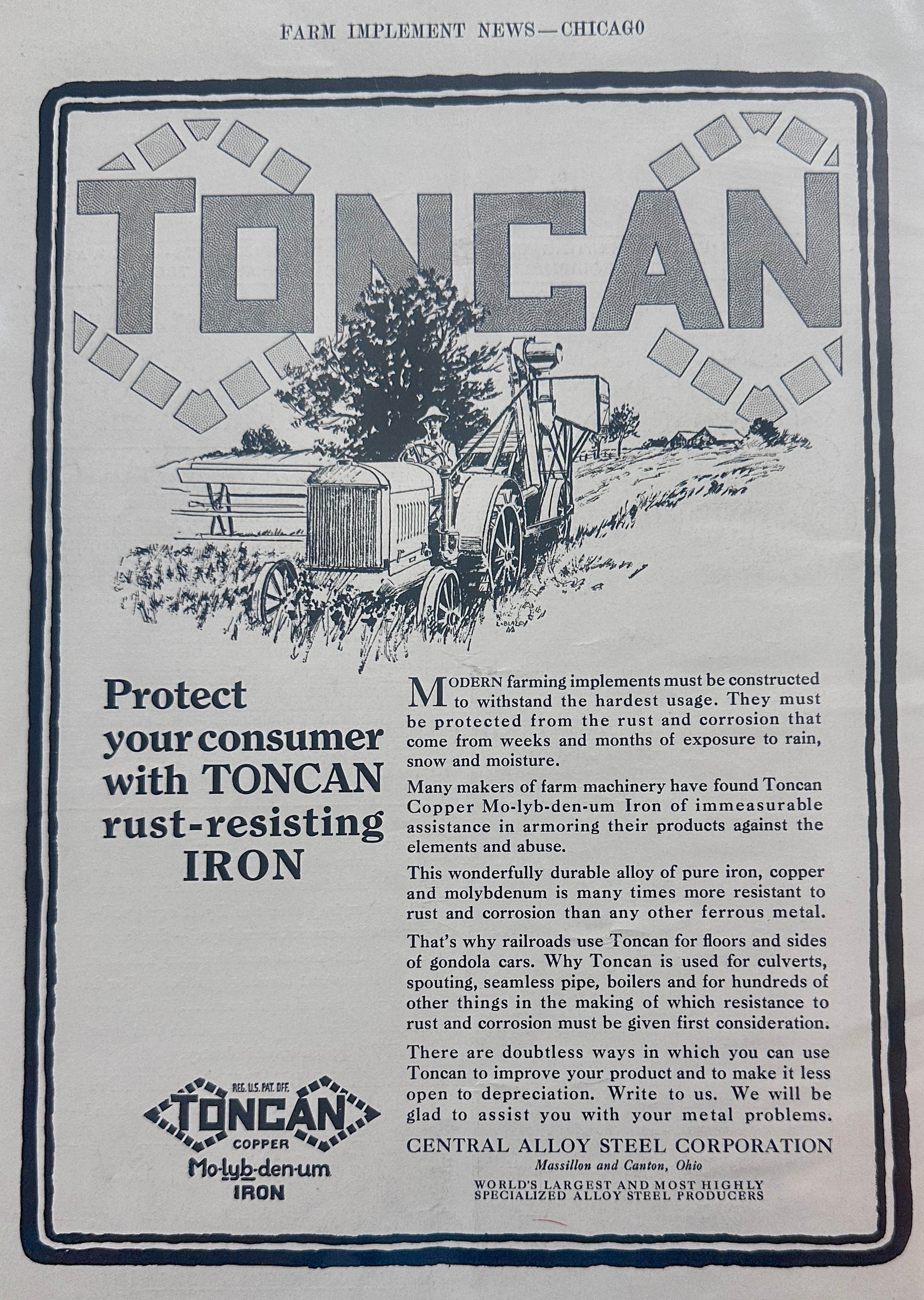 This original 9 x 12" magazine ad from 1929 showcases the wonders of TONCAN rust-resisting iron for farm equipment. The Iron was an alloy of Copper - Molybdenum and iron making it more durable to climate and temperature than non-alloy material. Produced in mills in Canton and Massillon Ohio. Nice vintage Tractor graphic.