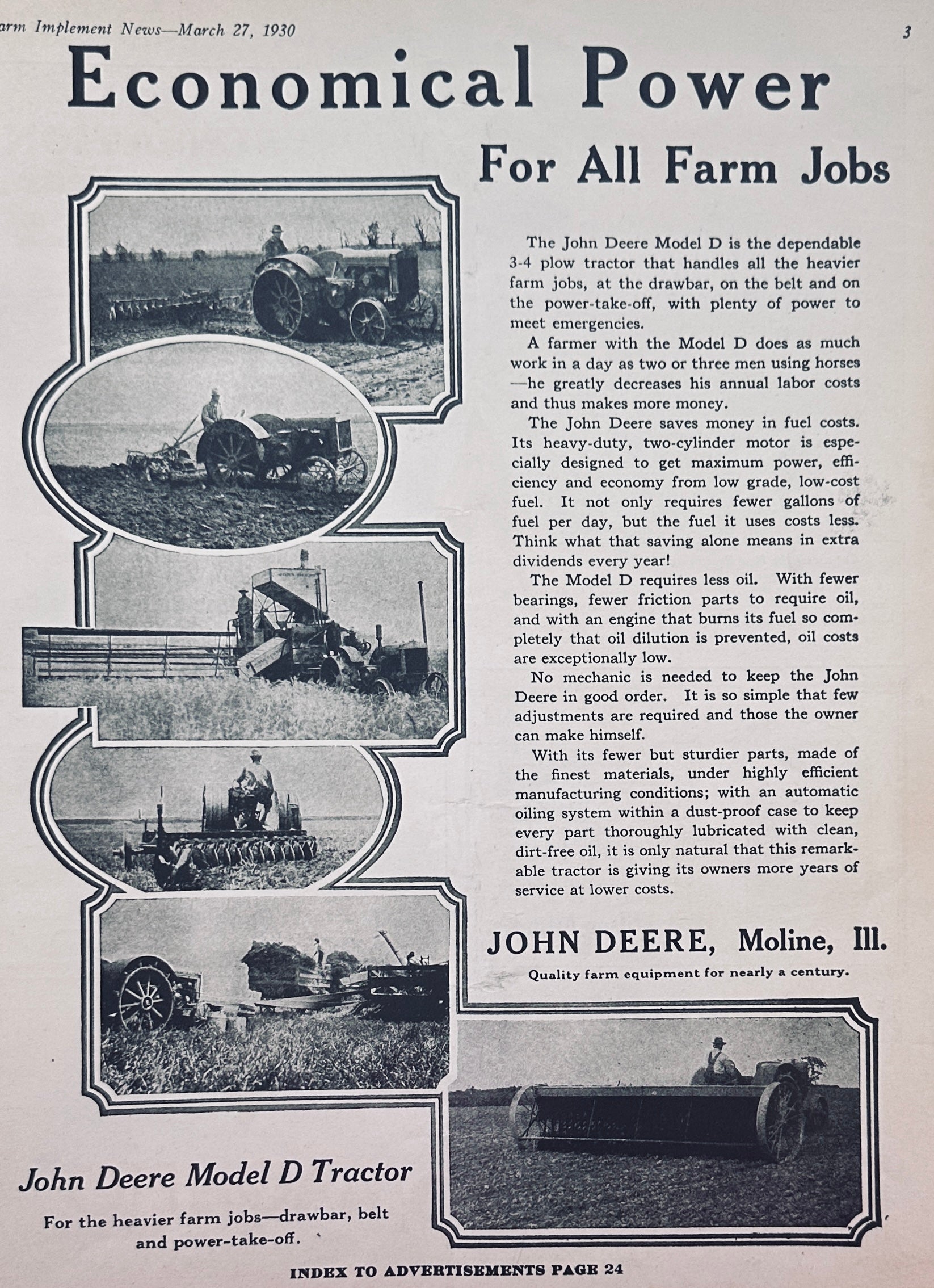 1930 John Deere Model D tractor Economical Power Ad #1210