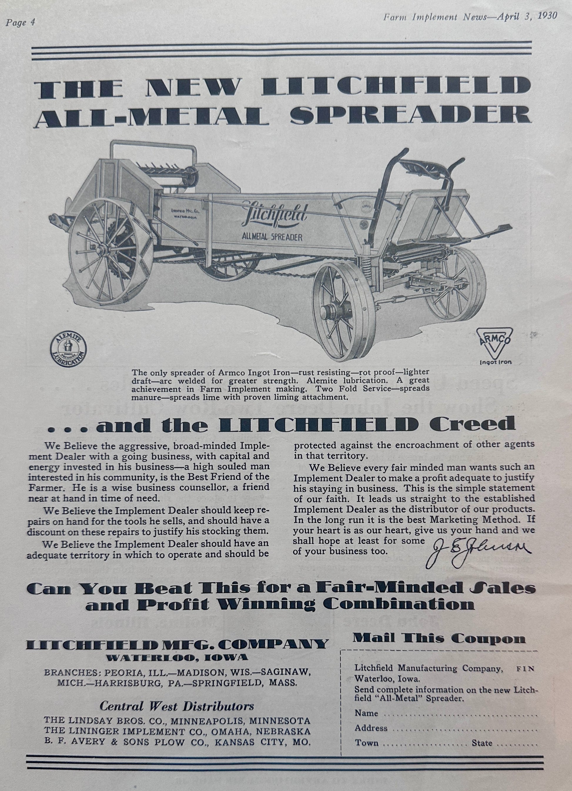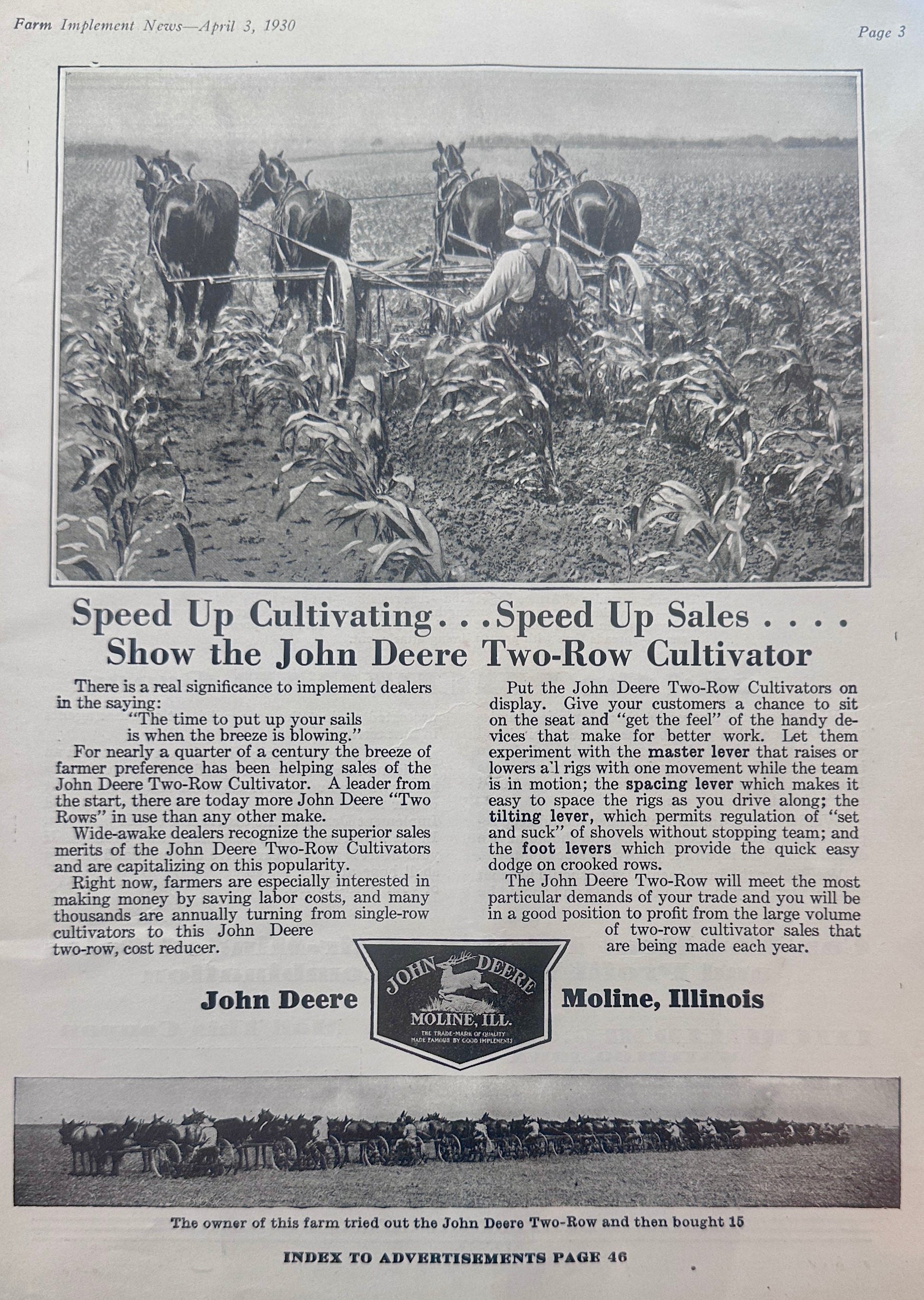 1930 Litchfield All-Metal Spreader & John Deere 2-Row Horse Drawn Cultivator Ad #1278