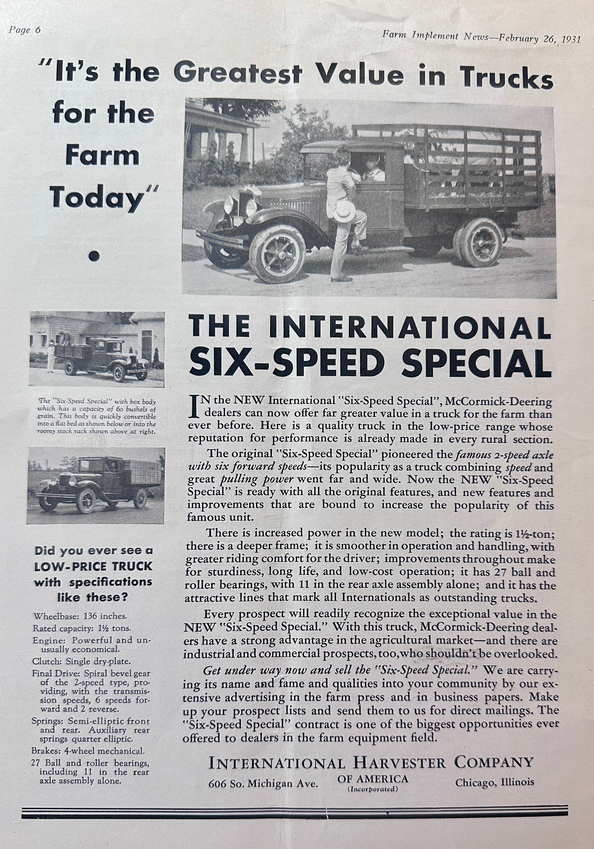 1931 International Six-Speed Special Farm Truck Ad #1421