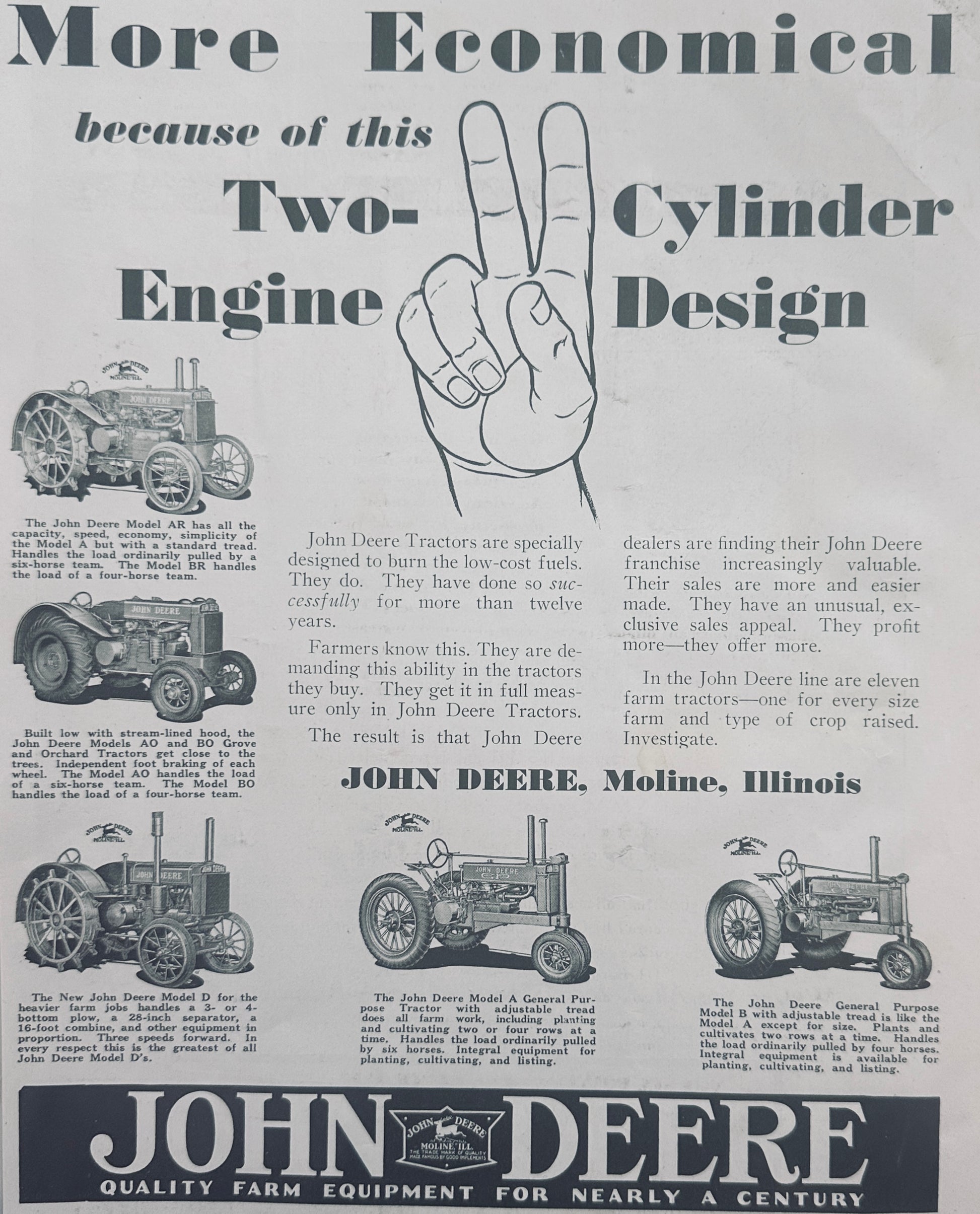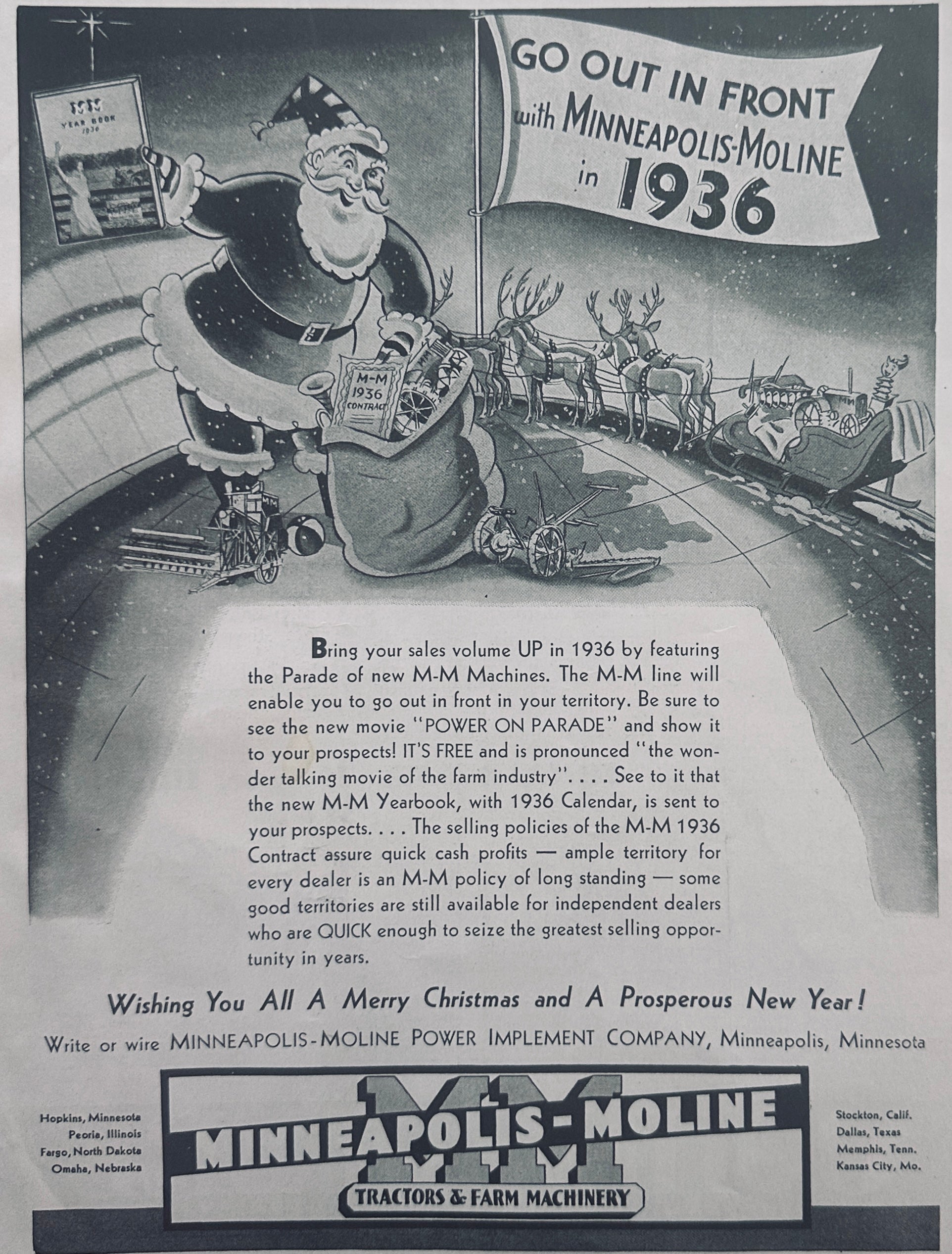 This original 8.5 x 11" magazine ad from 1935 showcases 5 models of John Deere Tractors boasting 2-Cylinder Engines, Models shown include AR, AO & BO, D, A, and B. As a bonus the ad on the reverse side is from Minneapolis Moline Wishing a Merry Christmas to all!