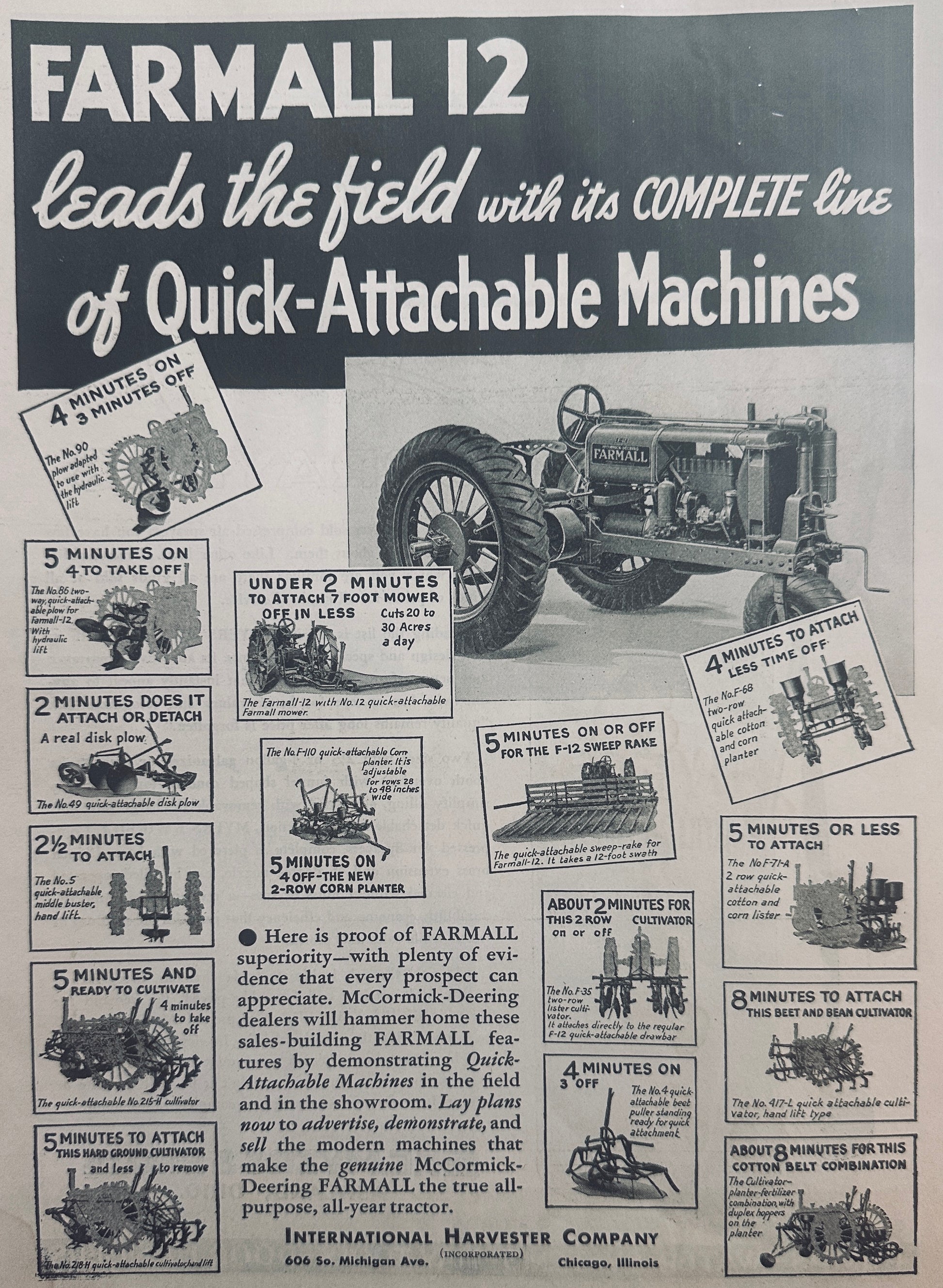 This original 8.5 x 11" magazine ad from 1936 showcases the 1936 Farmall 12 by International Harvester.