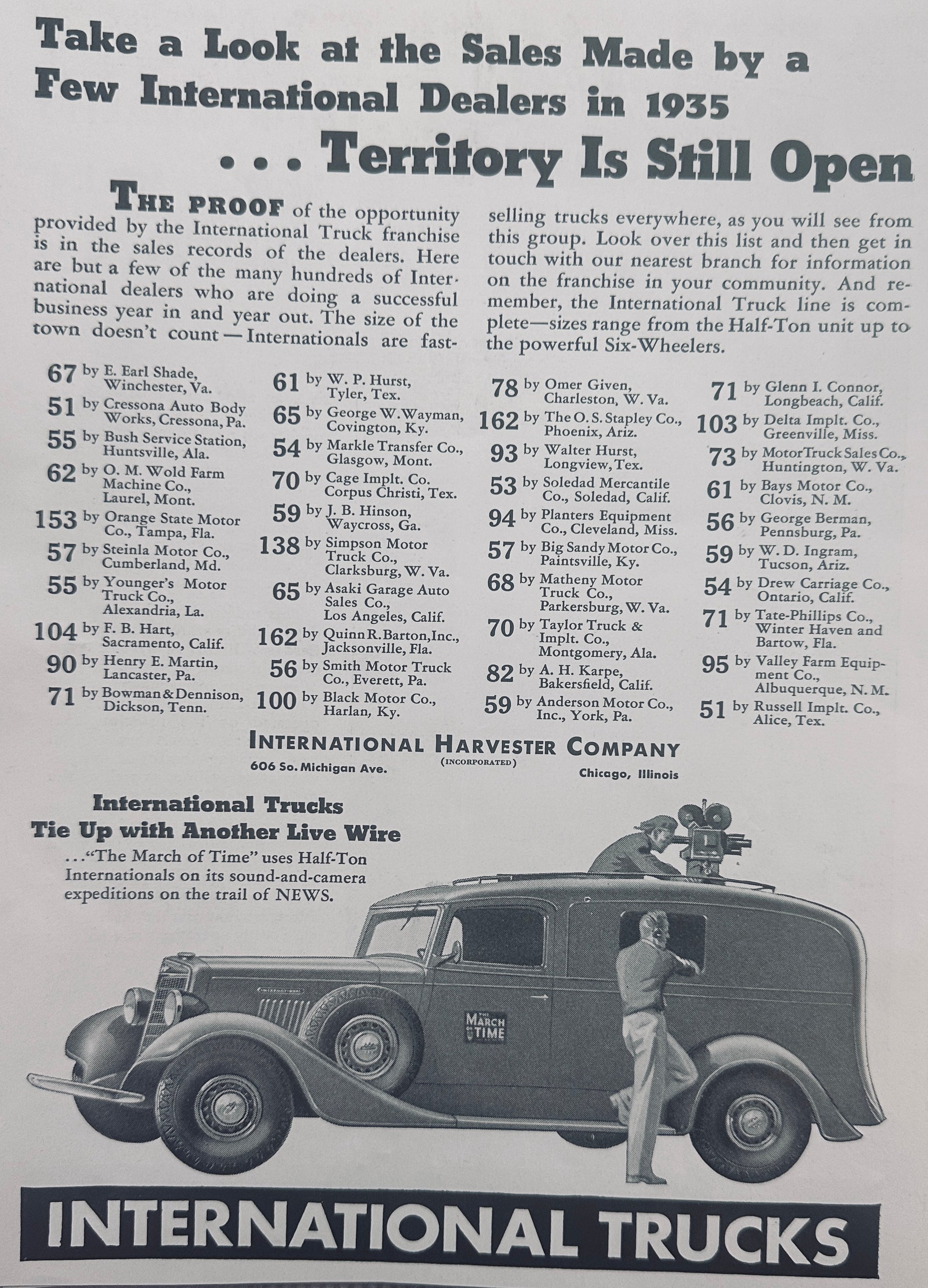 This original 8.5 x 11" magazine ad from 1936 targeted people interested in opening up an International Truck Dealership Franchise. Beautiful Step Van shown in the ad doing filming.