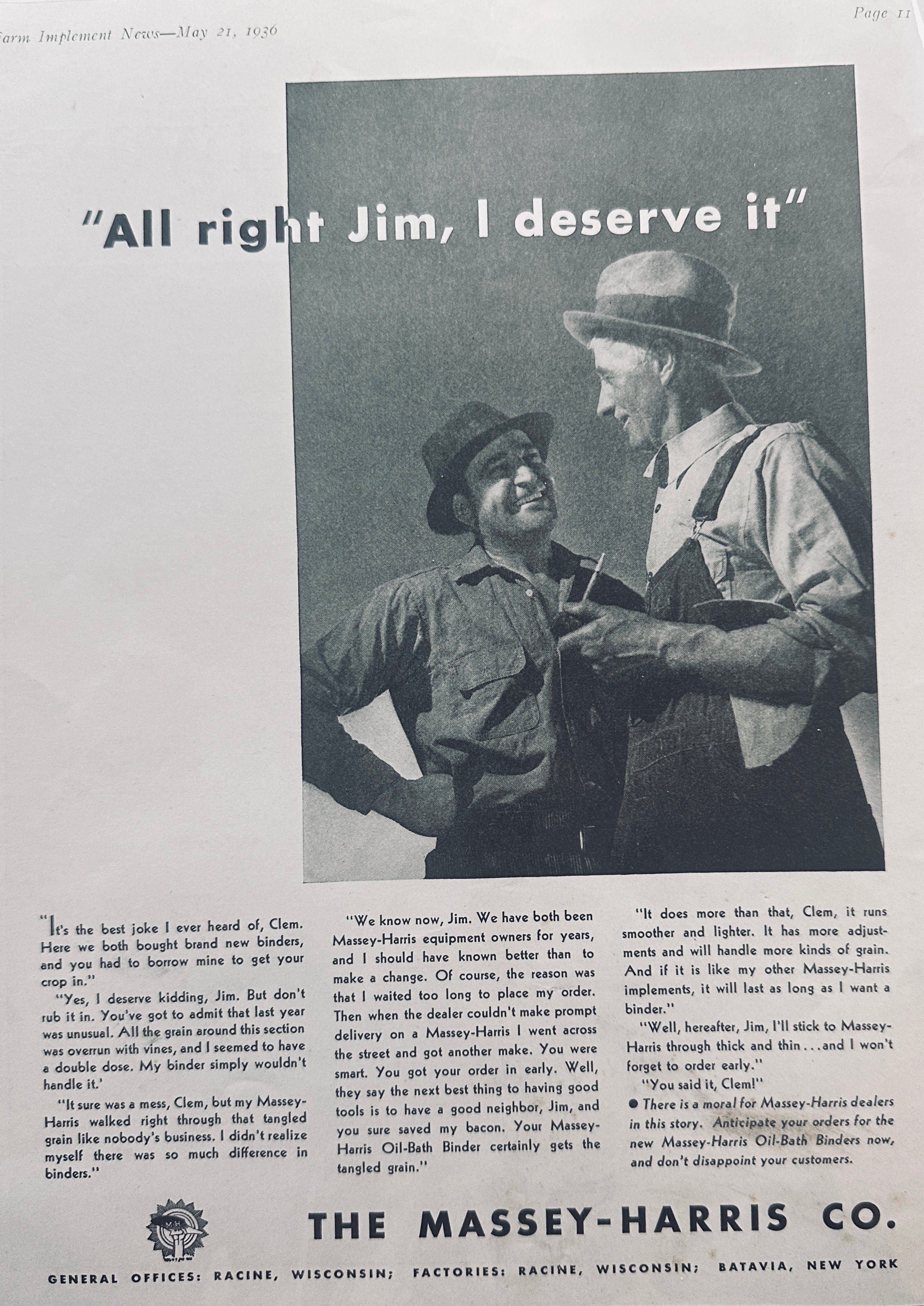 This original 8.5 x 11" magazine ad from 1936 showcases 2 Farmers discussing the virtues of using and the perils of not using Massey-Harris Binders when your fields have a lot of vines in your grain crop.