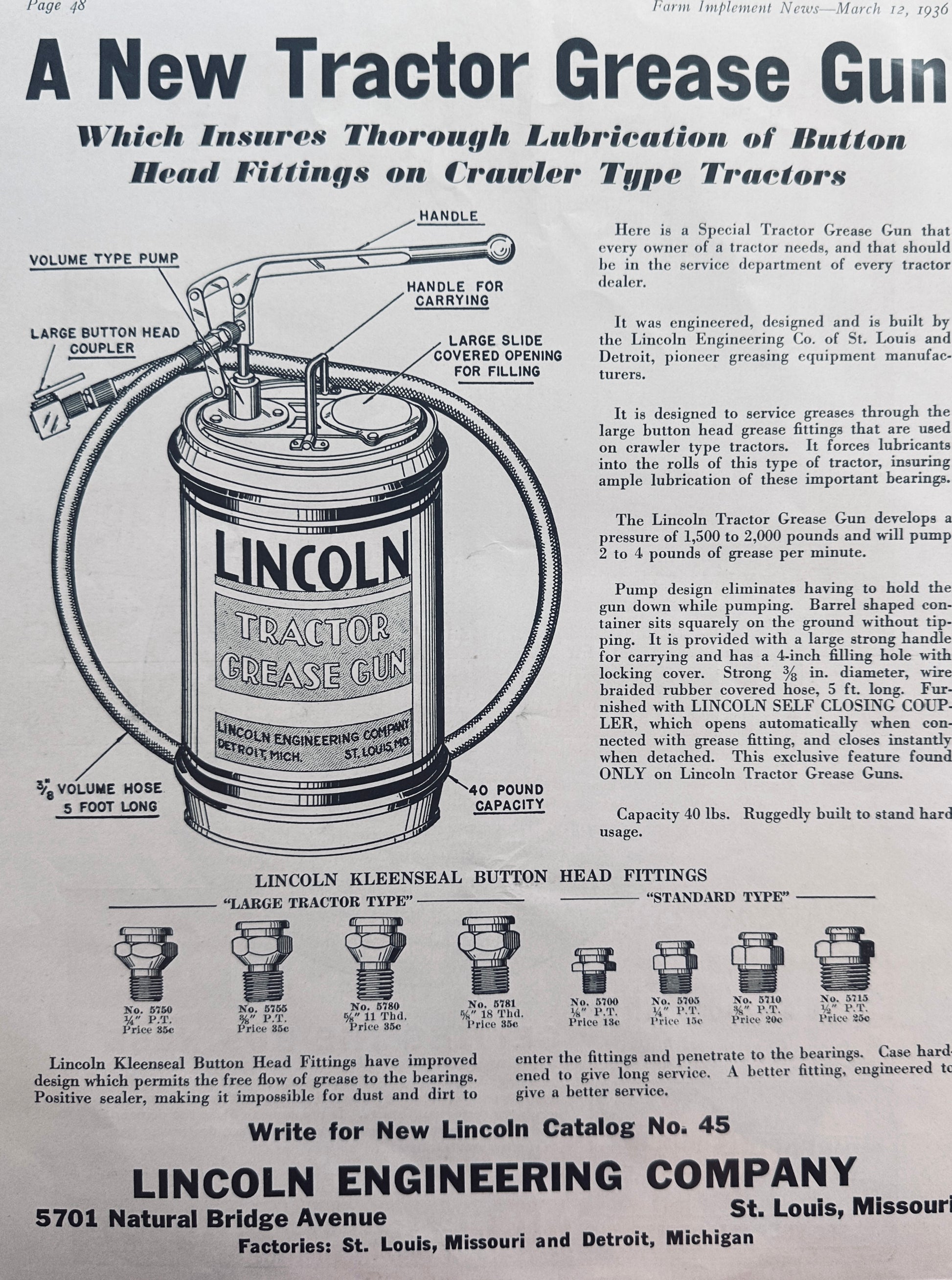 1936 Minneapolis-Moline "Harvester" Combine & Lincoln Tractor Grease Gun Ads N665