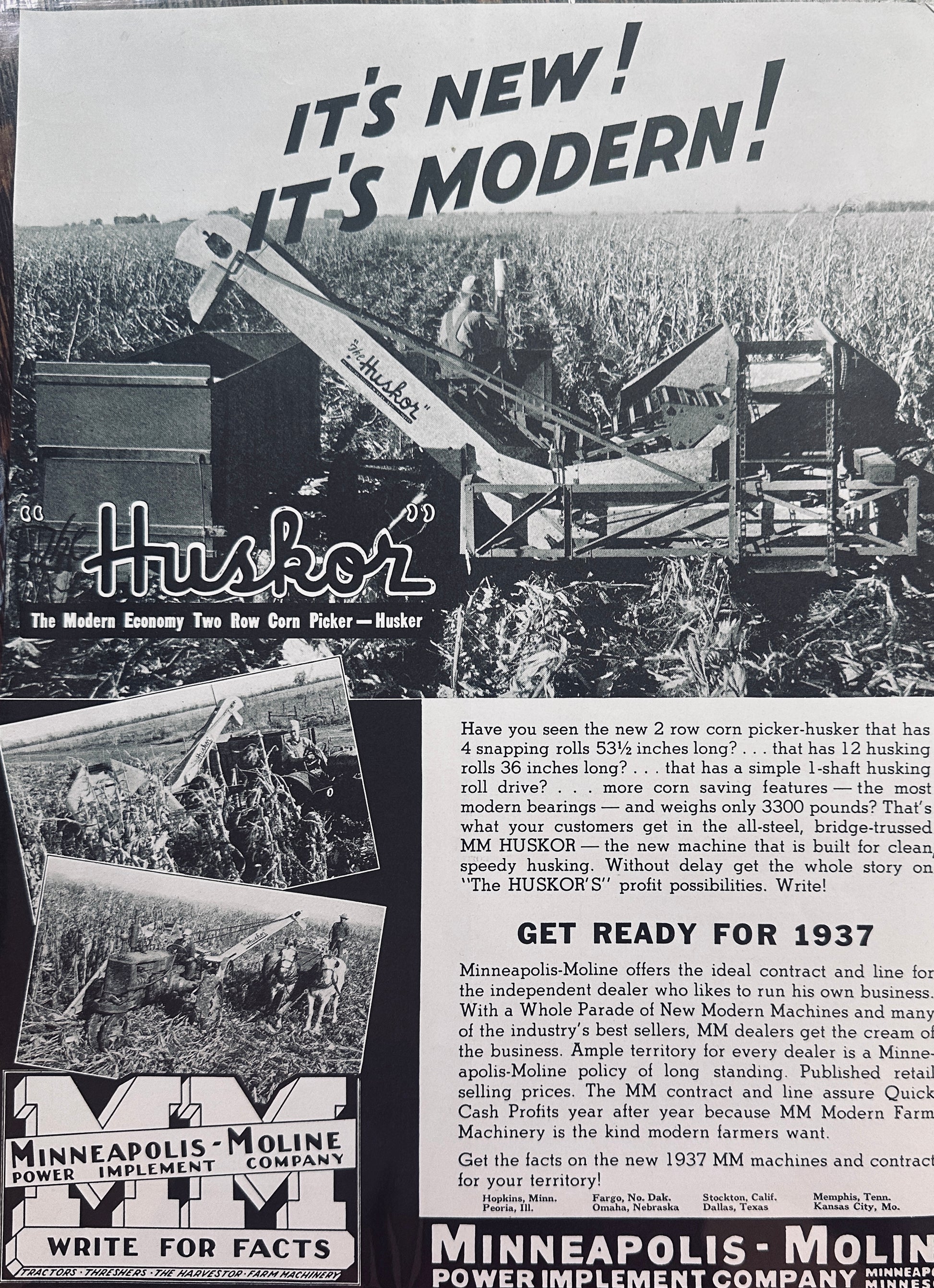 This original 9 x 12" magazine ad from 1936 showcases the all new "Huskor" 2-row corn picker-husker combination implement from Minneapolis-Moline.