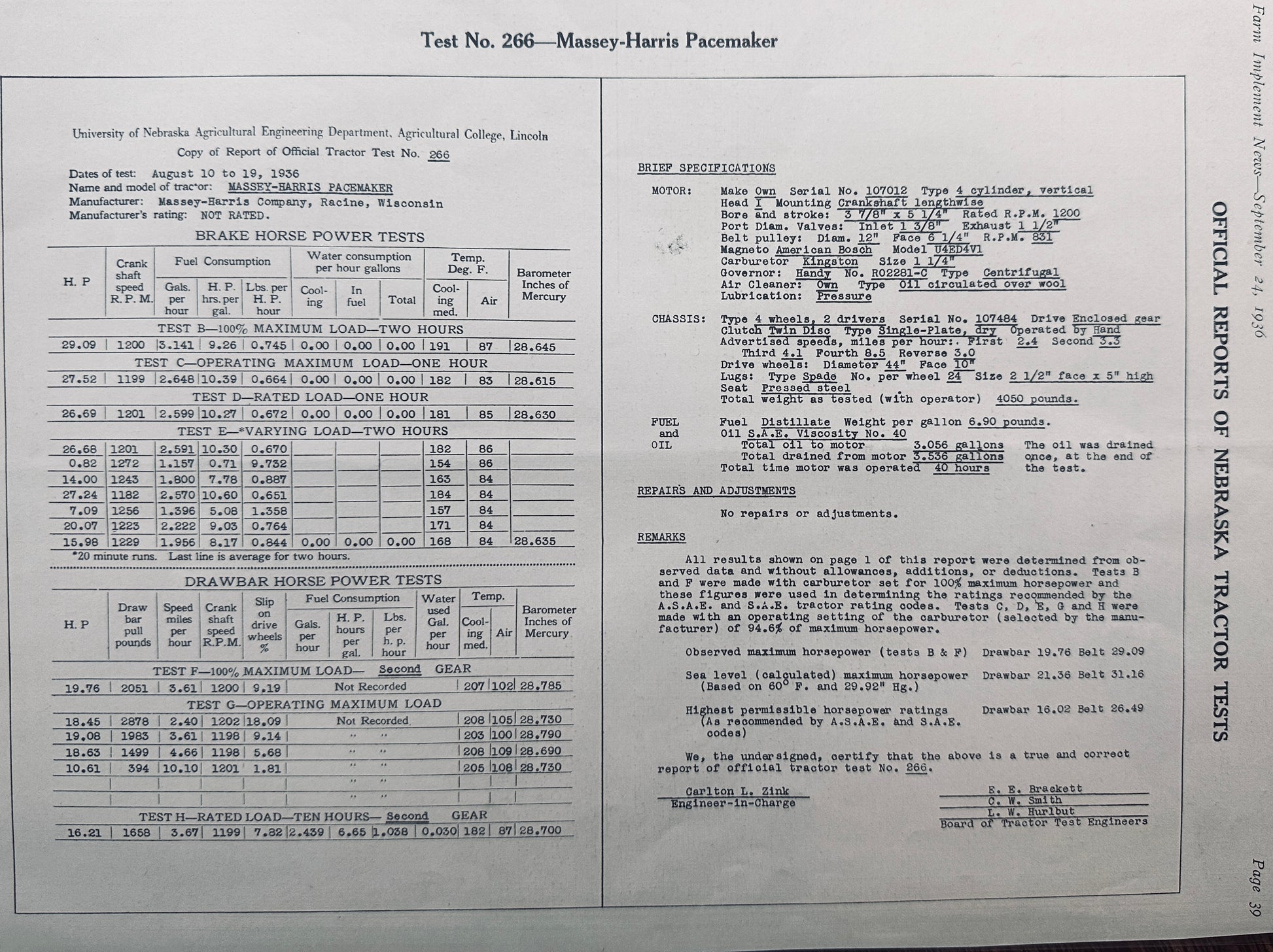 1936 Nebraska Tractor Test #266 Massey-Harris Pacemaker - Final Report N608
