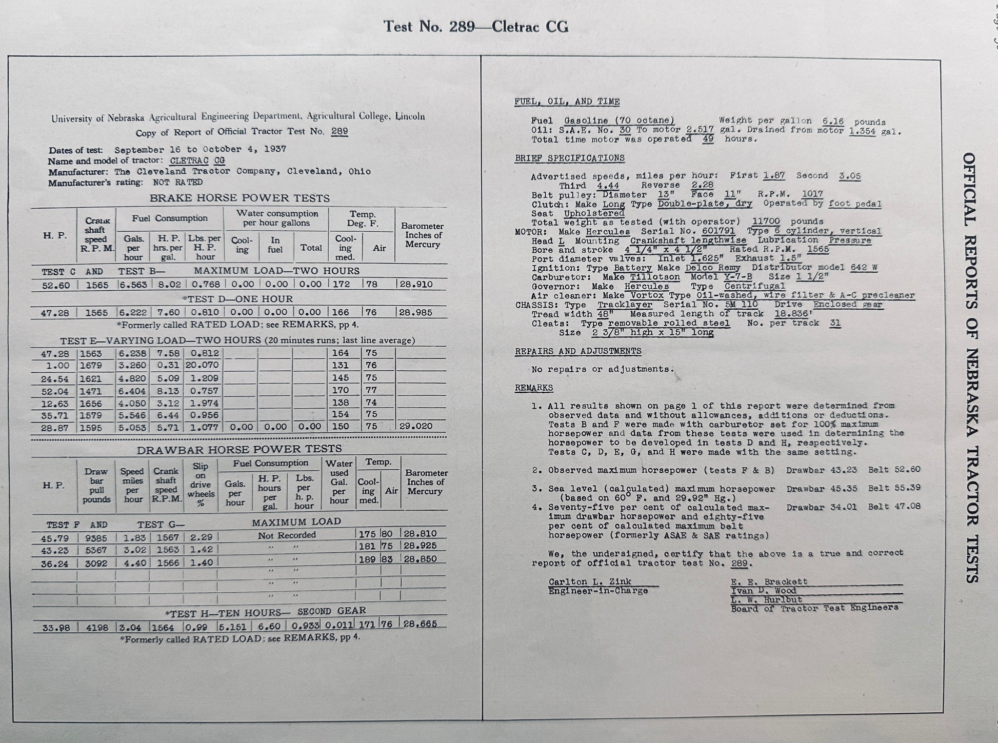 1937 University of Nebraska Tractor Test #289 - Cletrac CG N220
