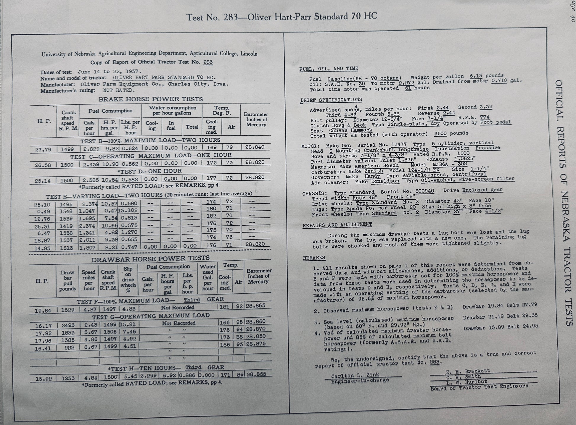 This original 8.5 x 11" page gives the results of University of Nebraska Tractor Test results for the 1937 Oliver- Hart-Parr Standard 70 "HC".
