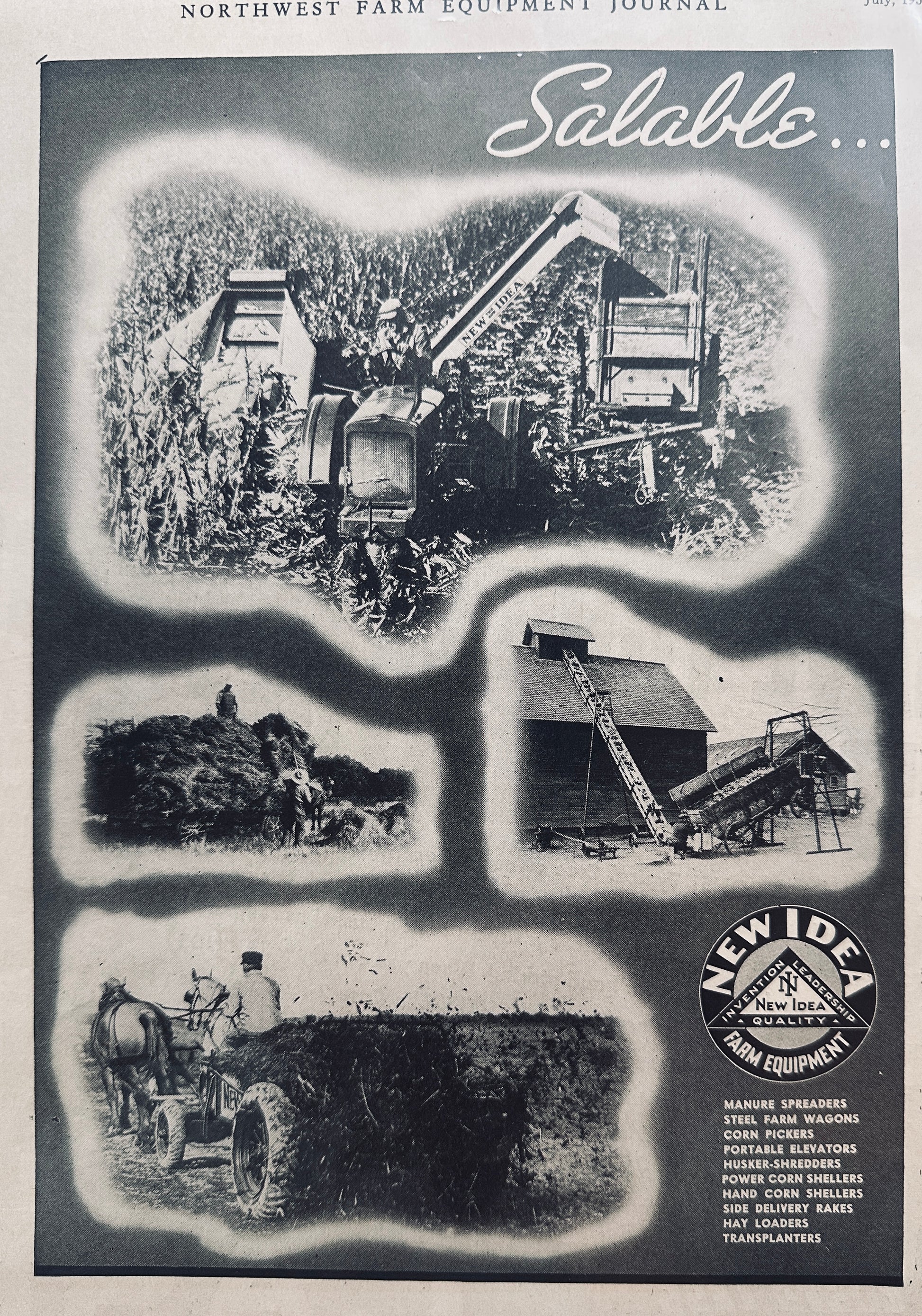 This original 2-page magazine ad from 1938 will measure @ 11 x 17" when fully open and carefully aligned. In this case I just took images of both pages separately however. The left side of the ad features working pictures of the various types of equipment at work, elevator, corn picker, hay loader and wagon and spreader The Right half of the ad provides the detailed copy of the equipment and gives the dealers reasons why they should carry the New Idea Product line.