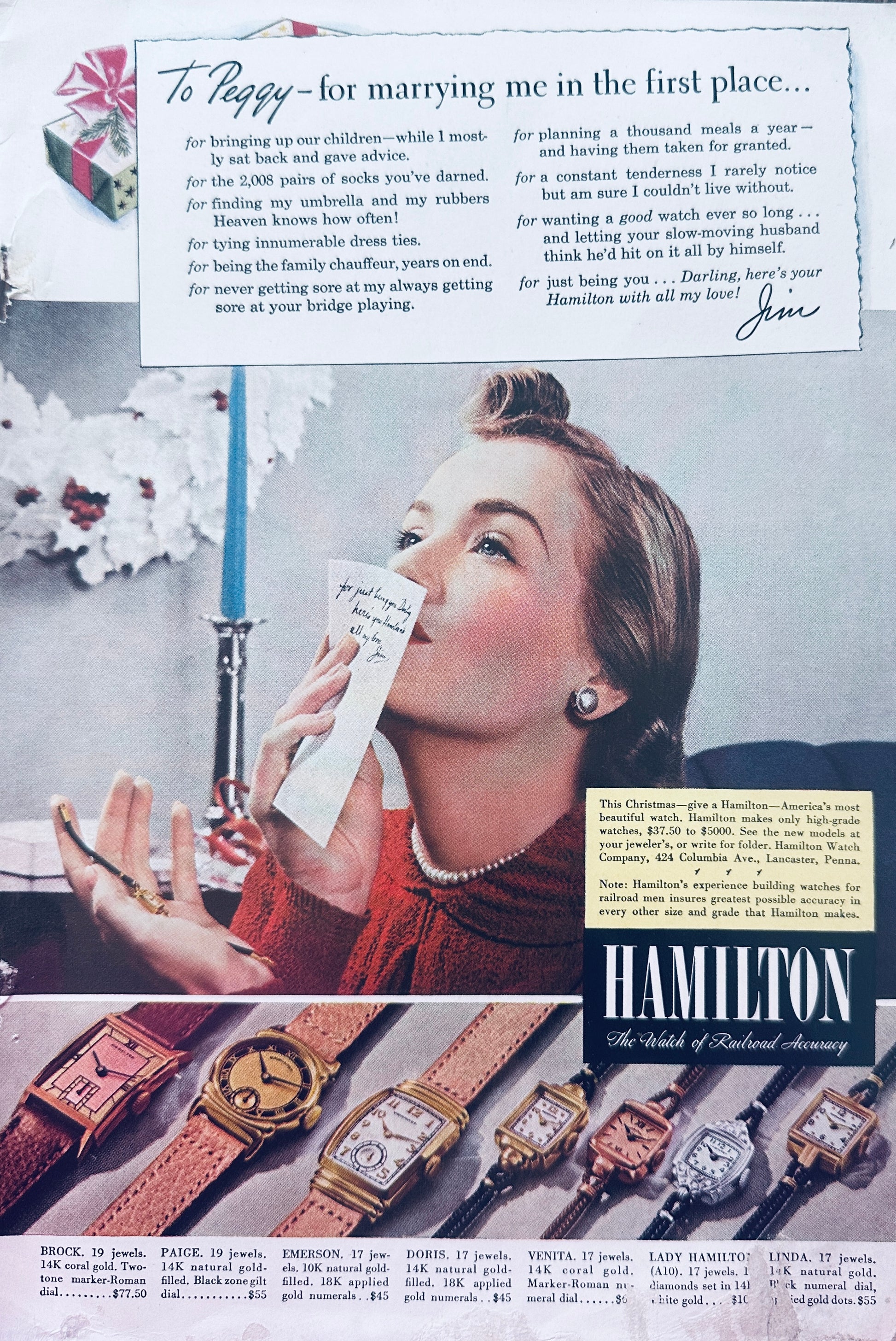 This original 7 x 10" magazine ad is printed in color and features 7 different styles of Hamilton Wristwatches from 1940. They include: The Brock, The Paige, The Emerson, The Doris, The Venita, The Lady Hamilton and the Linda. There is a little smudging on the lower edge that obstructs a few words tin the Linda copy. On the reverse side is a vintage Zenith Radio ad showing an unusual console style, looks like a cross between a Hammond Organ and a radio. This side has no staining or smudging.
