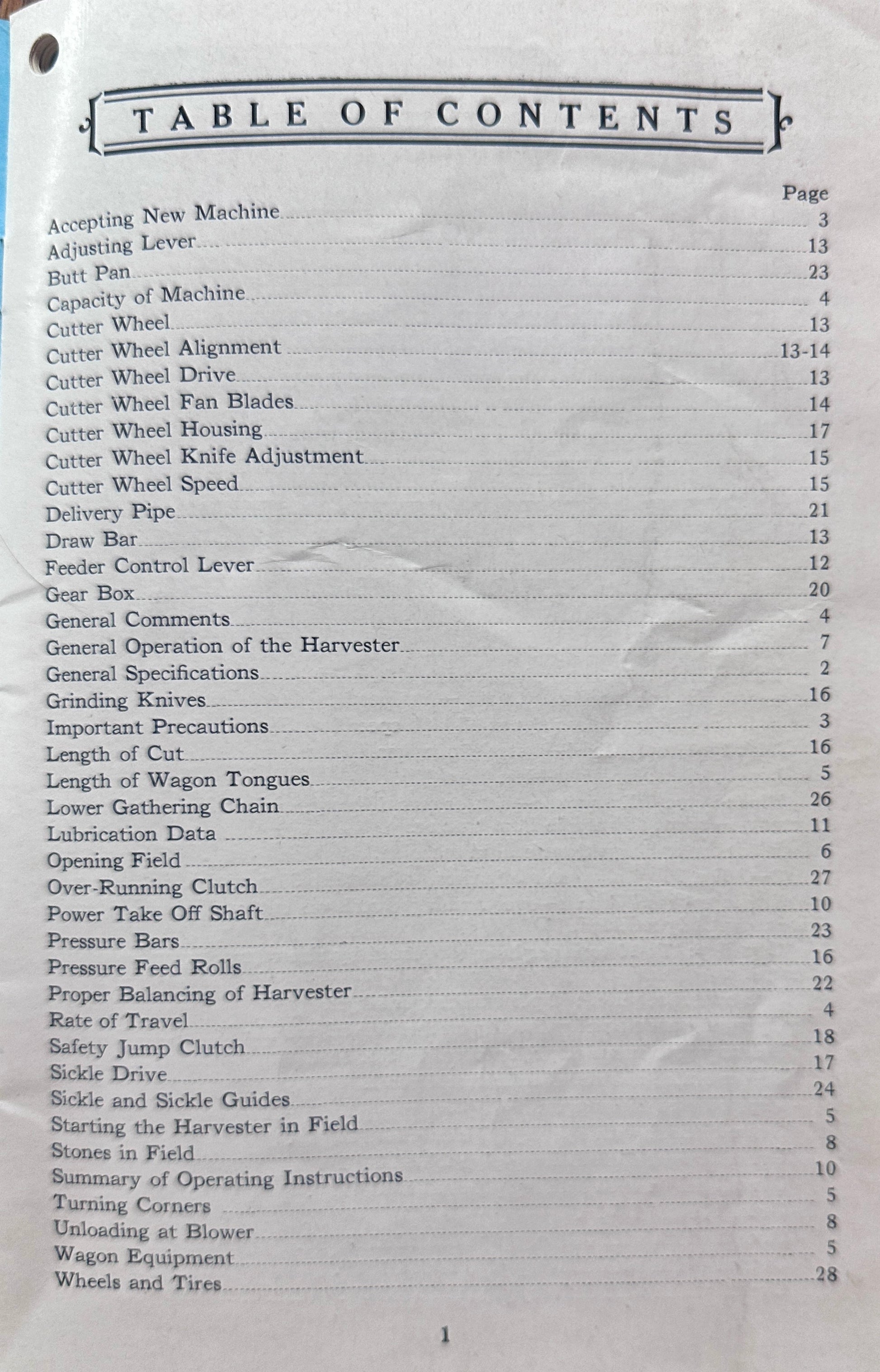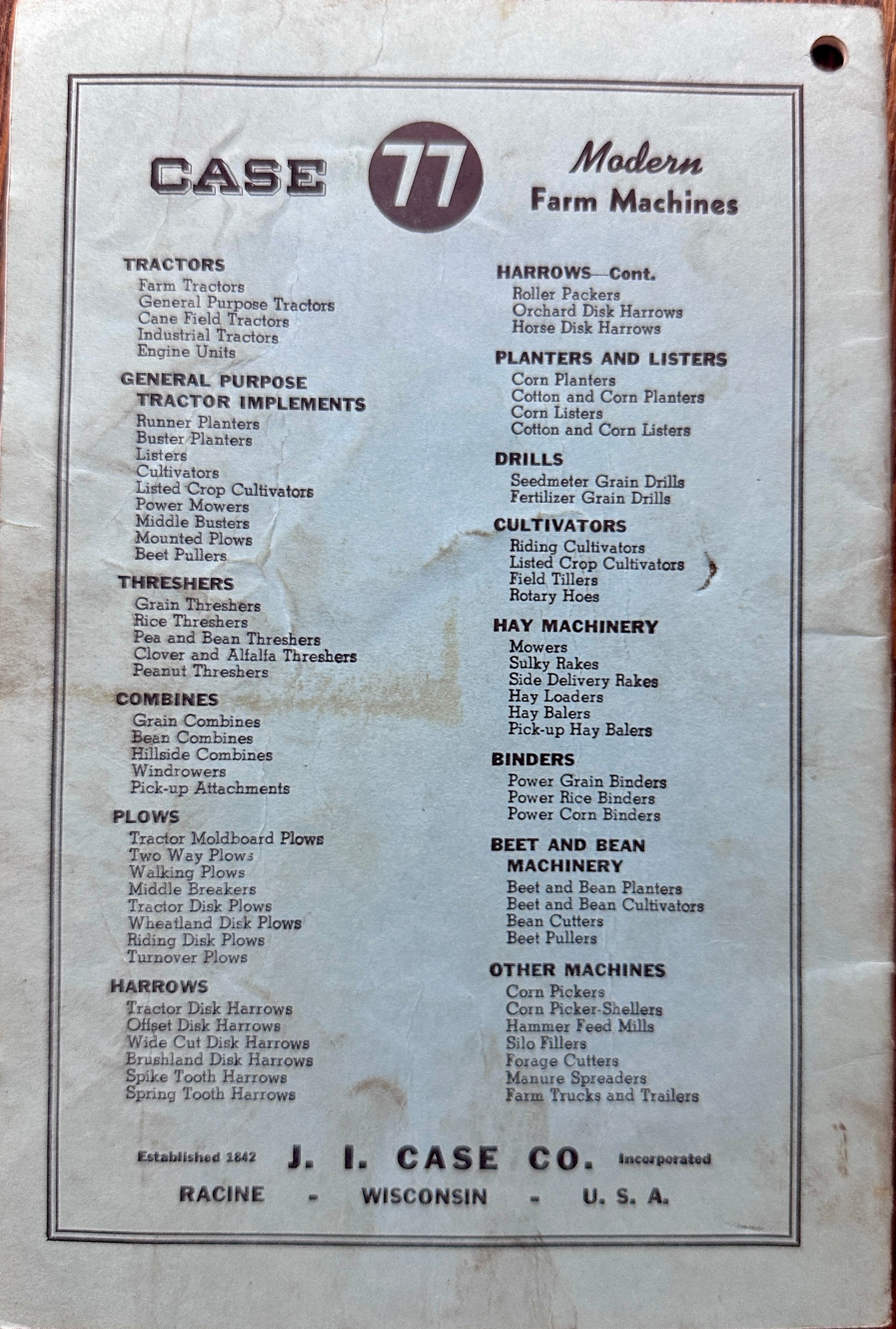 This original 7 x 9" operator's manual for the forties is for the Case Row Crop Field Forage Harvester. It is complete a bit dirty from farm storage but still legible. Form 5407 1200 6-46 is marked on the cover. Not all pages are shown, just a few to give an idea of condition.
