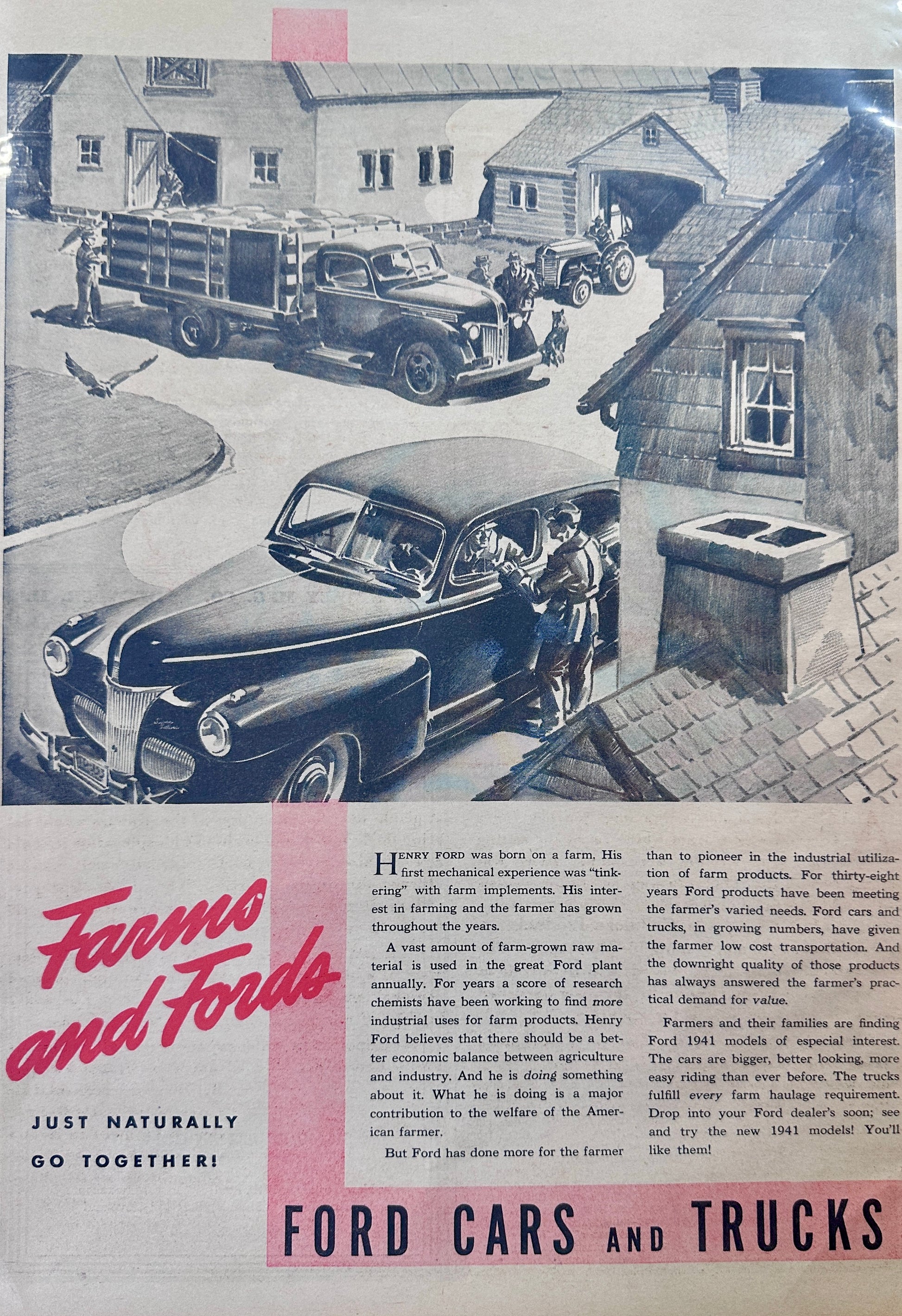 This original 10 x 13" magazine ad has it all when it comes to Fords & Farms. The ad from 1941 showcases the all-Ford Farm showing a tractor, slat-sided farm Truck and the Family sedan all in one scene.