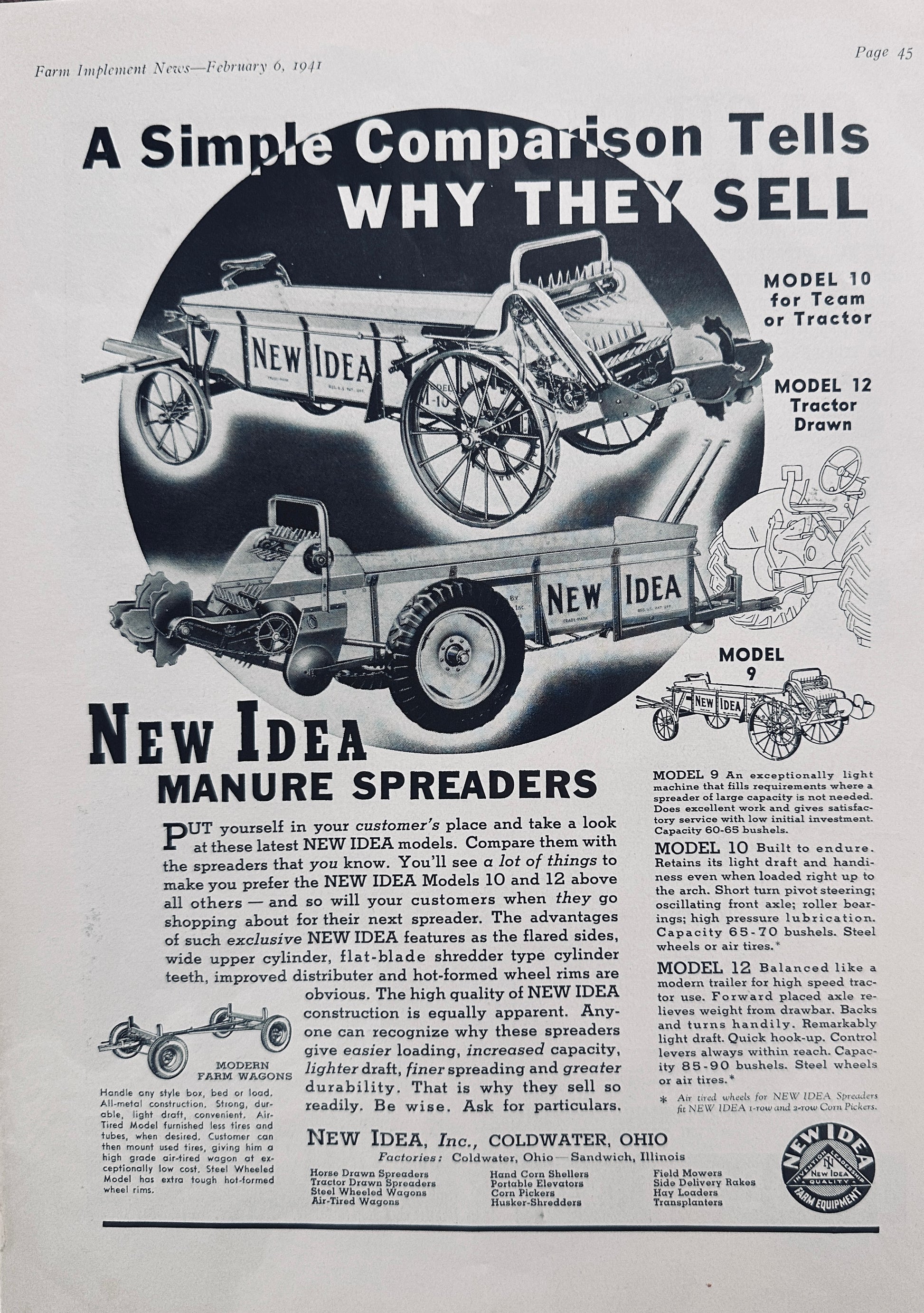 This original 9 x 12" magazine ad from 1941 showcases the line of New Idea Manure Spreaders for Team or Tractor. Models 9, 10 and 12 are shown on the ad and the features are described therein.