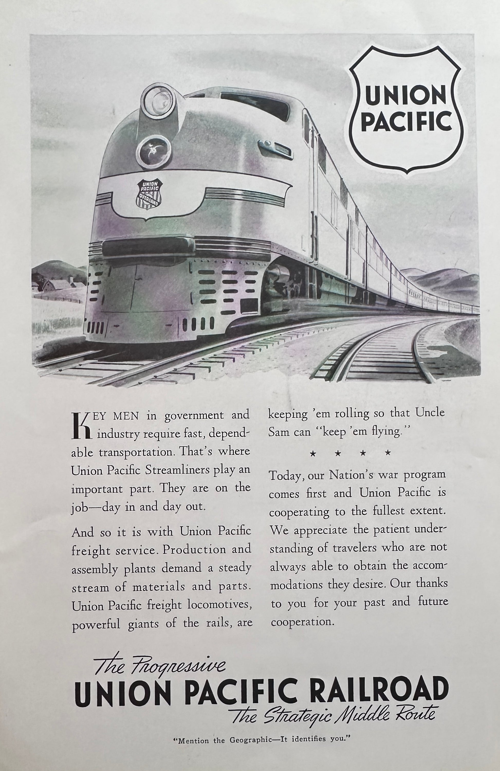 This original 7 x 10" magazine ad published in 1942 by Union Pacific to let every know that they could count on the train as a dependable and fast form of transportation during wartime.