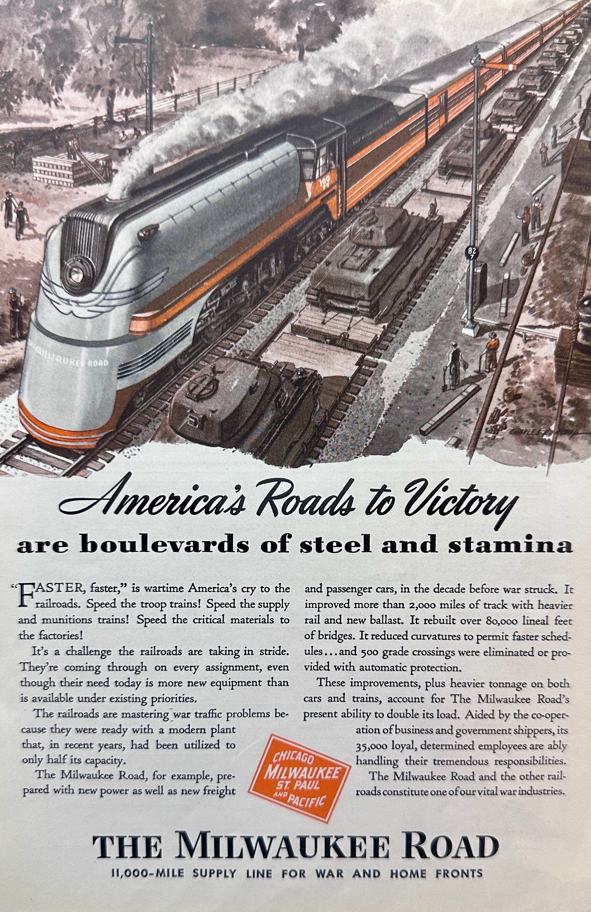 This original 7 x 10" magazine ad from 1943 showcases the business of The Milwaukee Road Railway system in WWII times. The image in the ad shows a sleek 1943 engine and transport of both Tanks and Passengers through the lines.