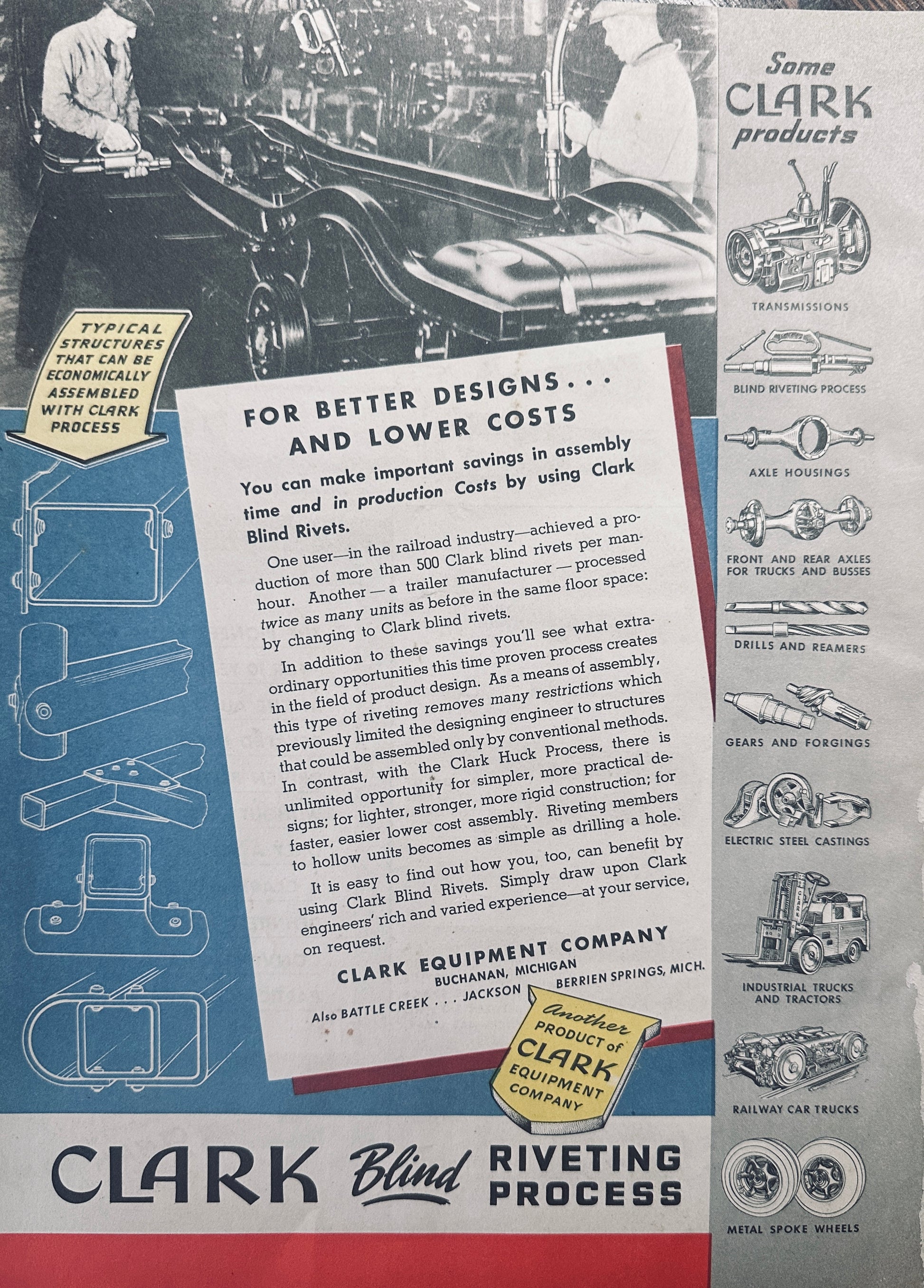 This original 8.5 x 11" magazine ad from 1944 is printed on both sides with a Clark Equipment Company ad for their Blind Riveting Process as developed and sold through their factory in Buchanan, Battle Creek, Jackson and Berrien Springs, Michigan.