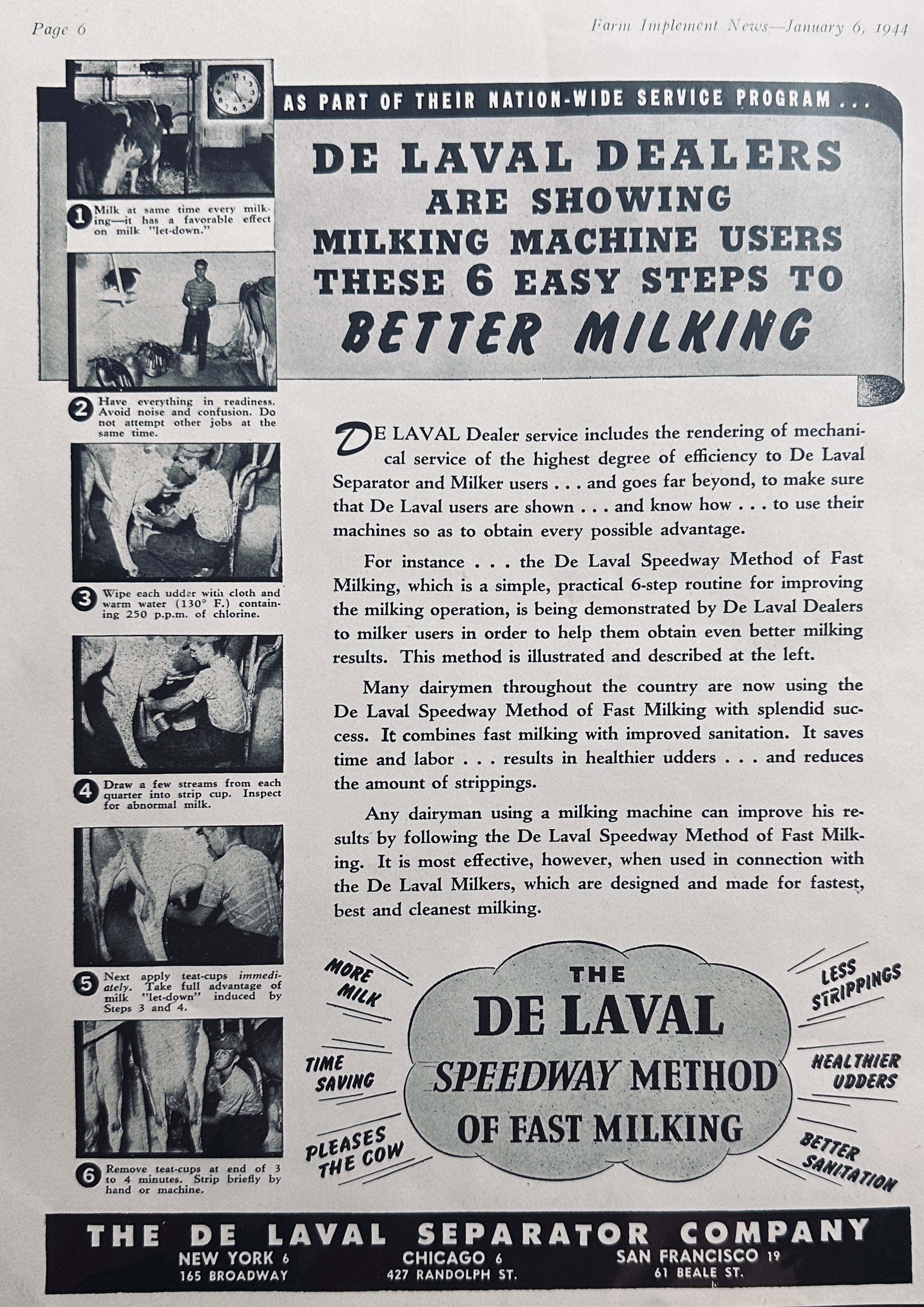 This original 8.5 x 11" magazine ad from 1944 describes 6 steps every dairy farmer should know about the DeLaval Speedway method of milking.