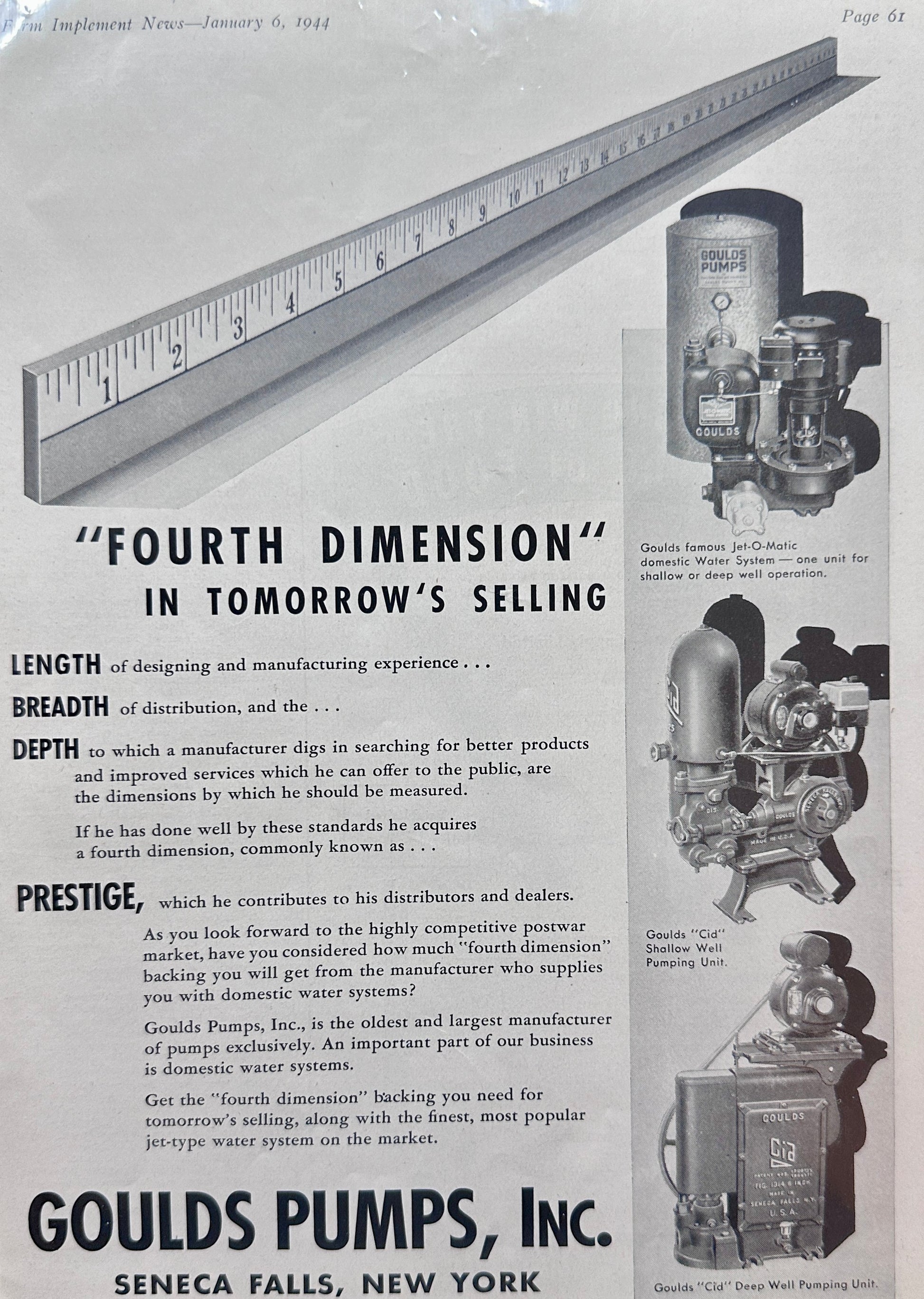 This original 8.5 x 11" magazine ad from 1944 encourages dealers to think in the Fourth Dimension of Selling, Length, Breadth, Depth and Prestige! Goulds Pumps of Seneca Falls NY has a long history of 96 years of production by 1944.