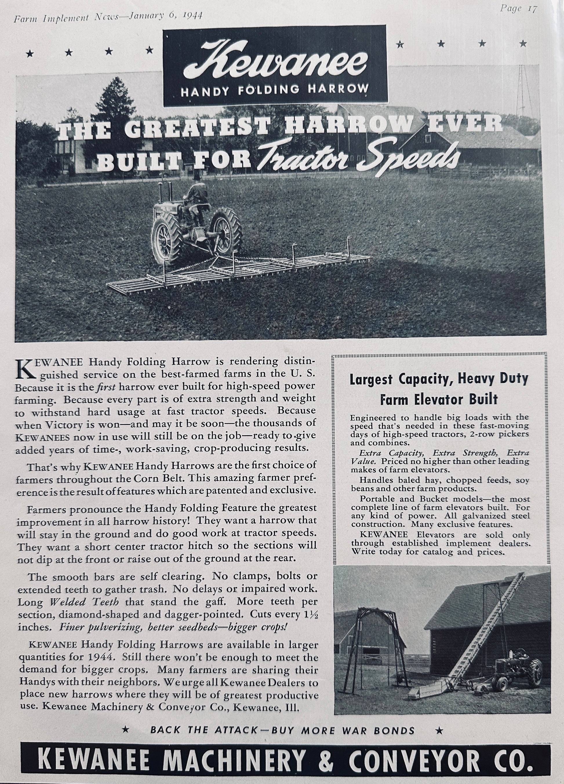 This original 8.5 x 11" magazine ad from 1944 showcases the Kewanee handy folding Harrow attachment as well as the largest capacity, heavy-duty Farm Elevator.