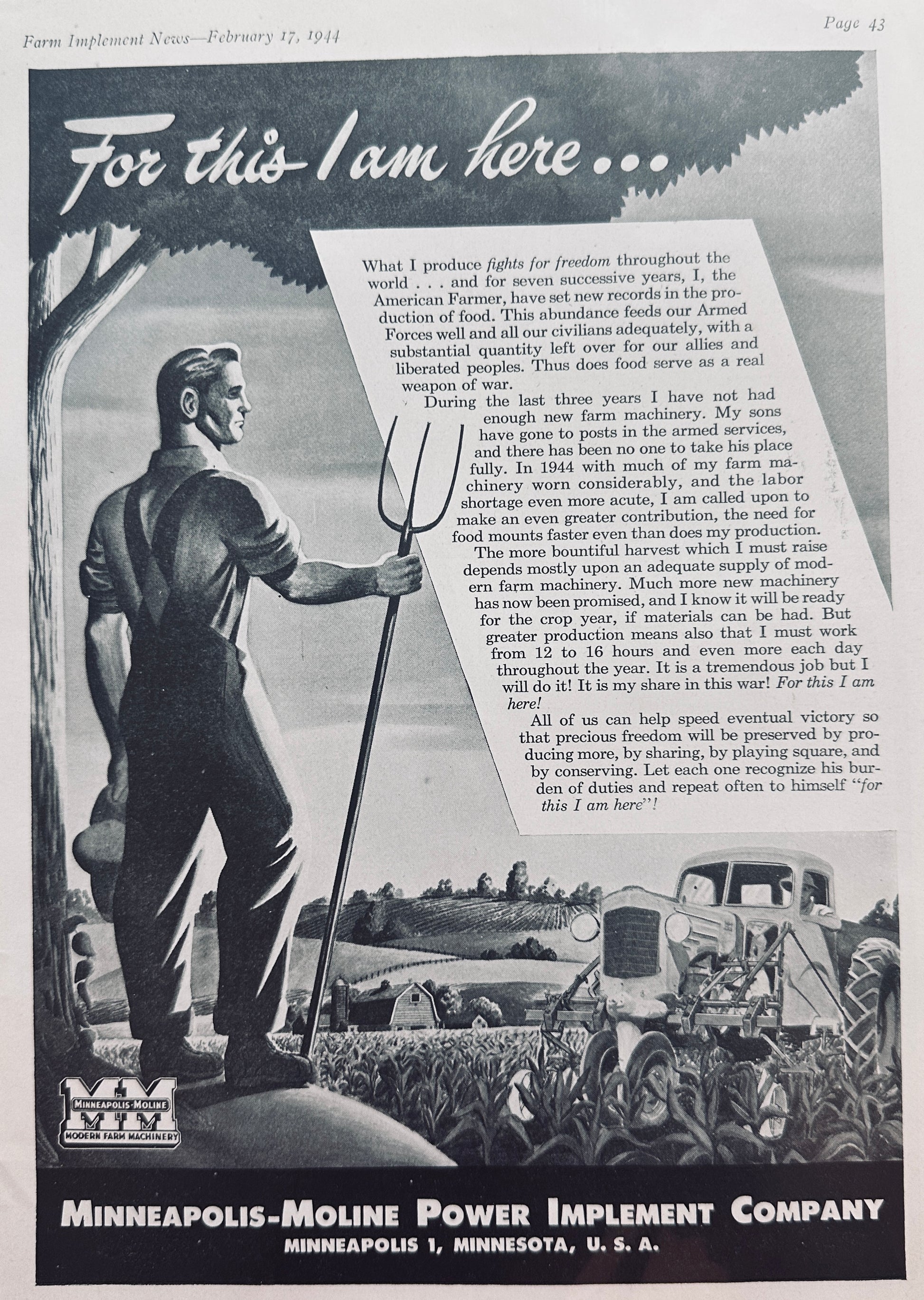 1944 Minneapolis-Moline Patriotic WWII era PSA Ad For This I Am Here! N658