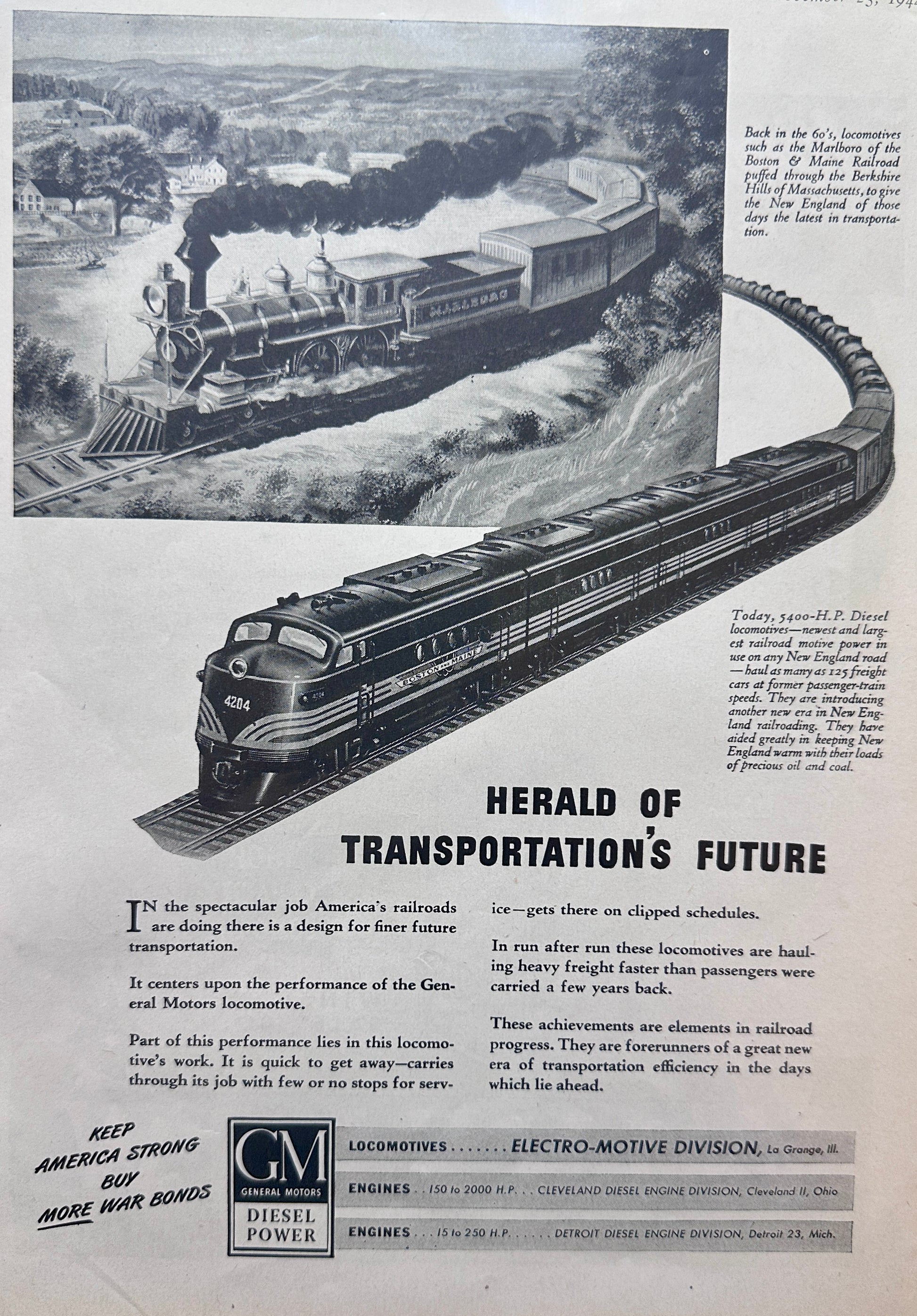 This original 7 x 10" magazine ad from 1944 WWII Era showcases the General Motors Diesel Locomotive as used by the Boston & Maine Railroad designed to haul up to 125 freight cars at passenger train speeds.