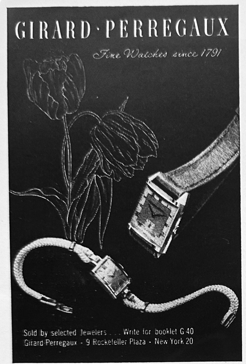 This lot consists of 4 separate Girard-Perregaux Watch Ads from 1945. All ads are untrimmed from their original 7 x 10" pages. They range in size from 2.5 x 3" up to 2.5 x 7" in size. All images have been cropped to focus just on the watch ad portions specifically.