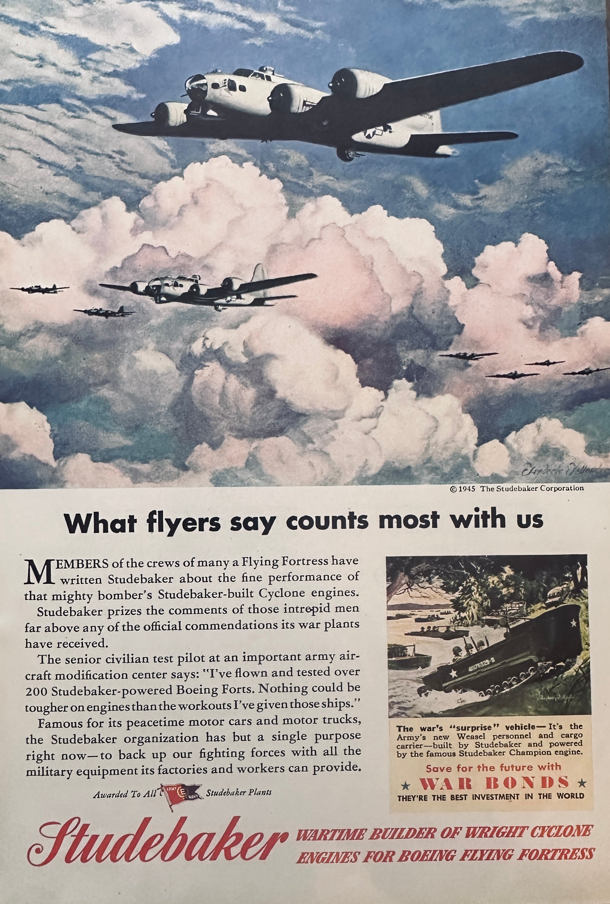 This original magazine lot of (4) 1945 WWII Era Ads Feature Studebaker products as supplied to the US Military in support of the Allied War Effort. The First & Third ad feature the Studebaker Weasel an Sea/Land Craft similar in nature to the Famous Ducks used in many theme parks still across the nation. The Other two ads feature the Father-Son Relationship within Studebaker as having the parent at home in the factory and the child in the field during the war. All are in excellent condition and measure 7 x 10" in size.