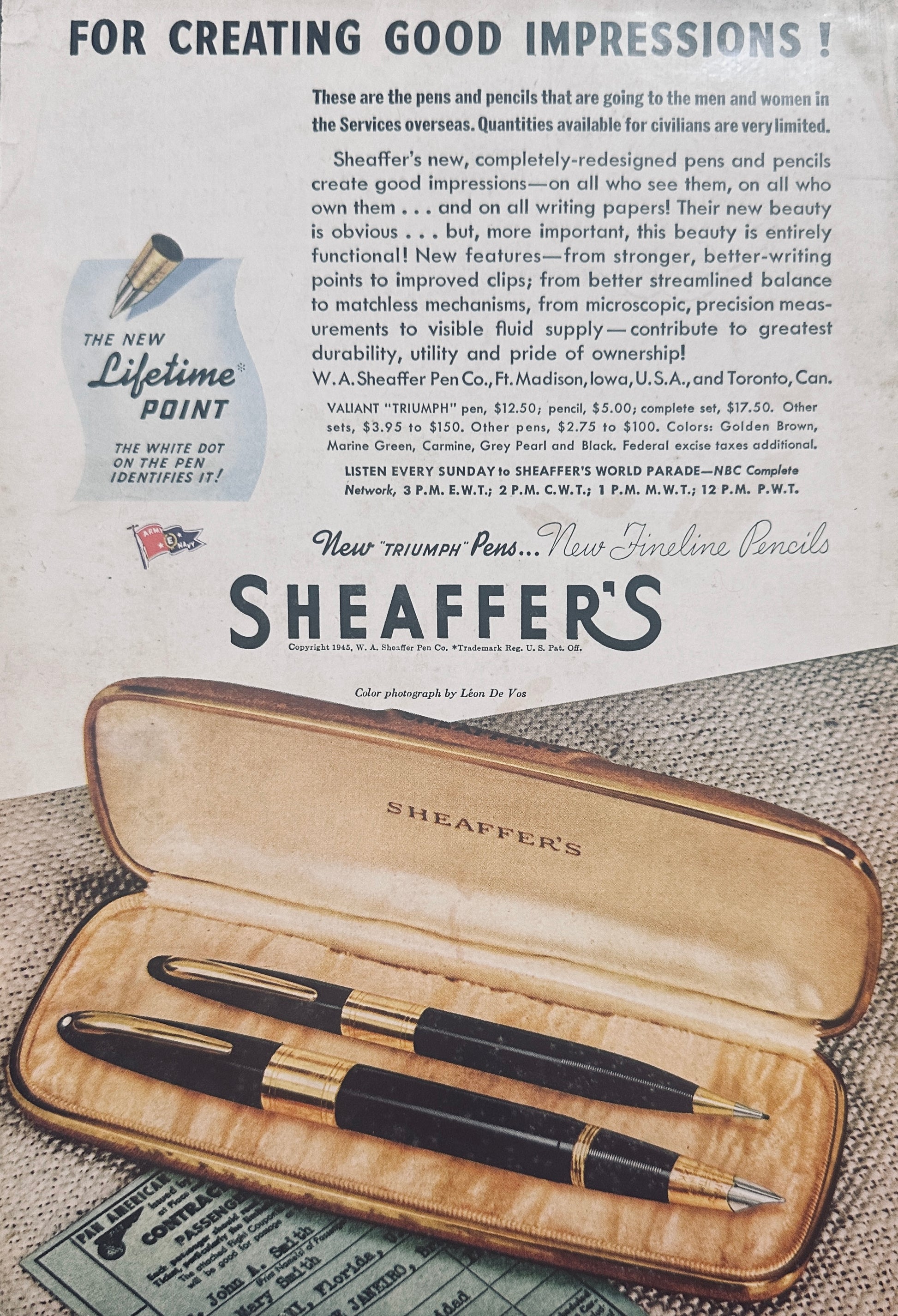 This original 7 x 10" magazine ad from 1945 WWII Era showcases the Sheaffer's Triumph Pen Set in Black and Gold - For creating good impressions. Light period patina.