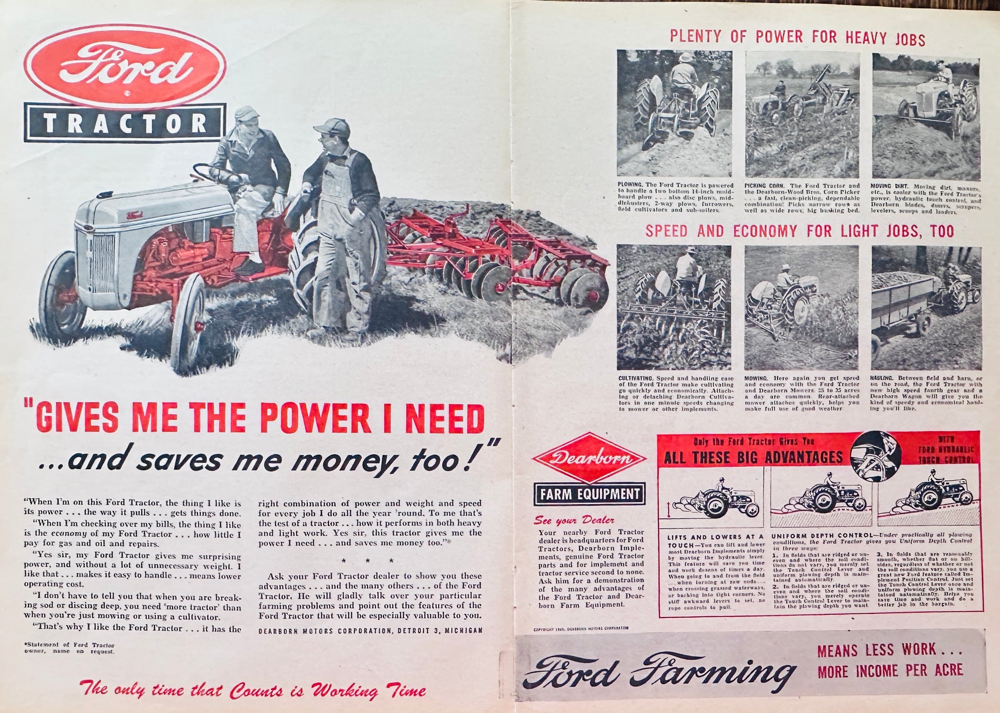 This original 2 page magazine ad measures @ 11 x 17" when carefully aligned and fully open as shown in the image. IT features the Ford Tractor from 1948 in several configurations doing work around the farm.