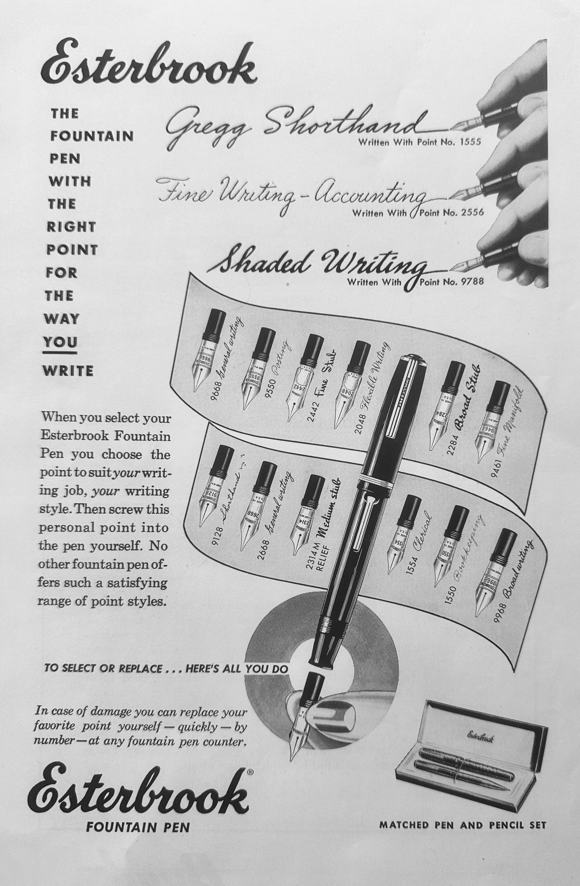 1949 Esterbrook Fountain Pen with 15 Nib styles Shown - Vintage Ad N332