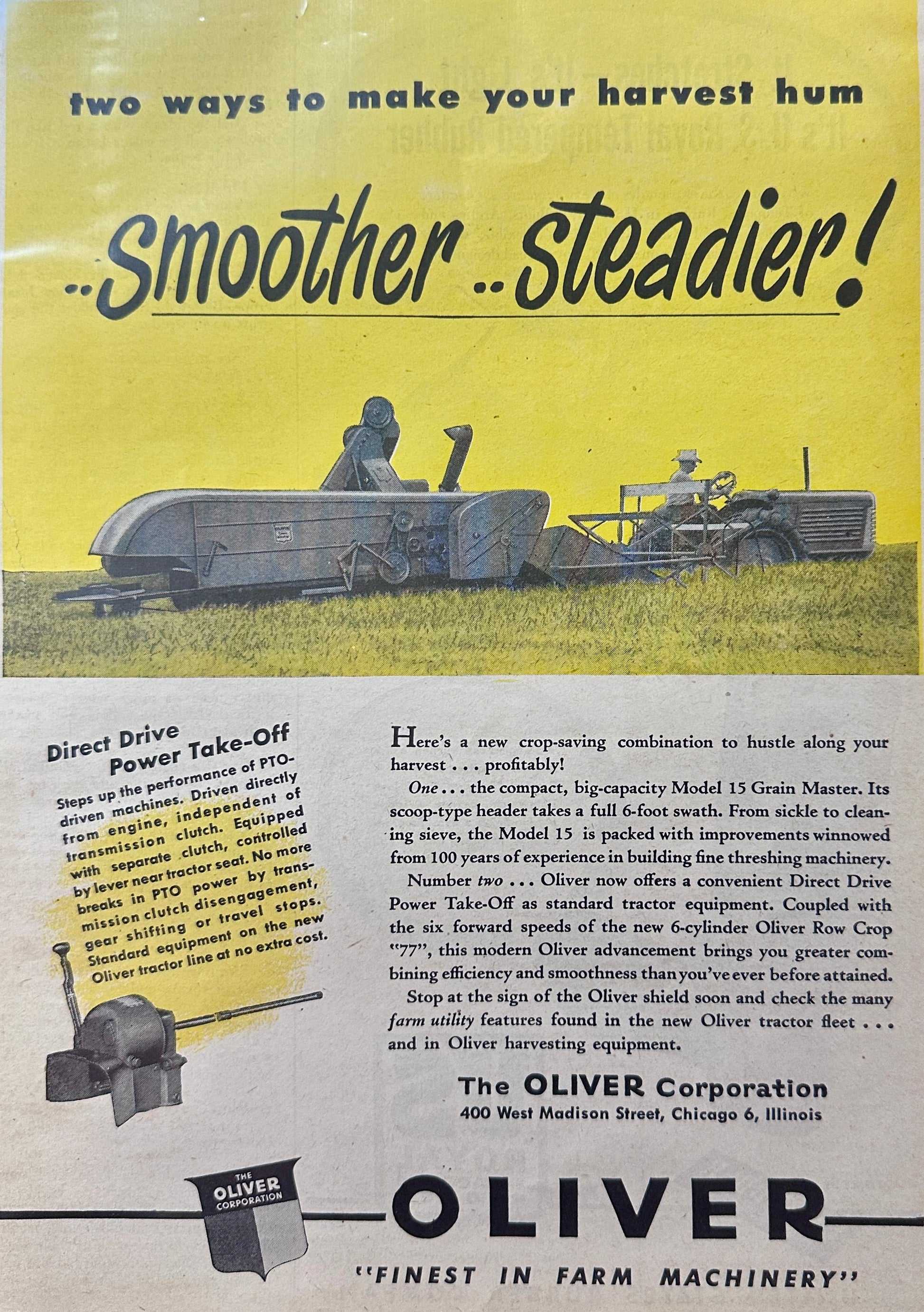 This original 8.5 x 11" magazine ad from 1949 showcases the field combination of the Oliver 15 Grain Master and the 6-cylender Oliver Row Crop "77" with PTO to give you greater combining efficiency.