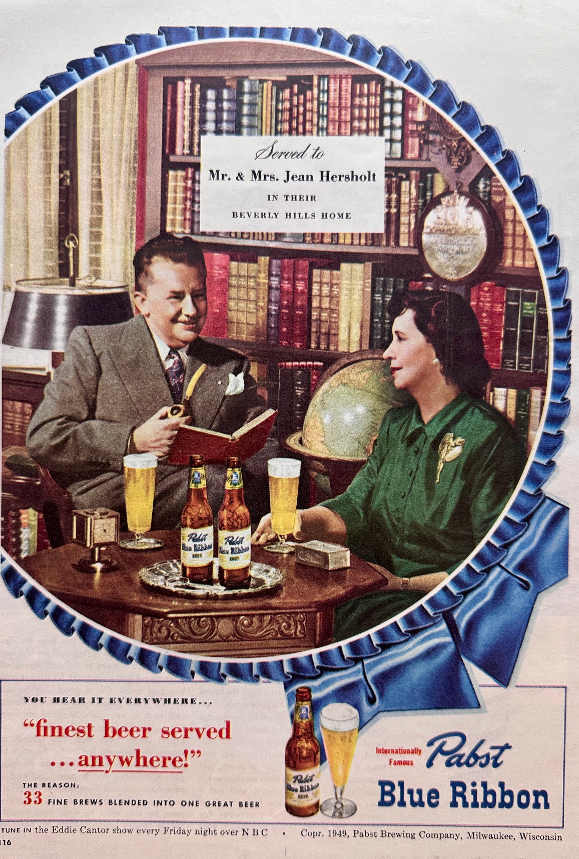 This original 8.5 x 11" magazine ad was published in 1949 and features Mr. & Mrs. Jean Hersholt enjoying Pabst Blue Ribbon Beer - PBR, in their Beverly Hills home.