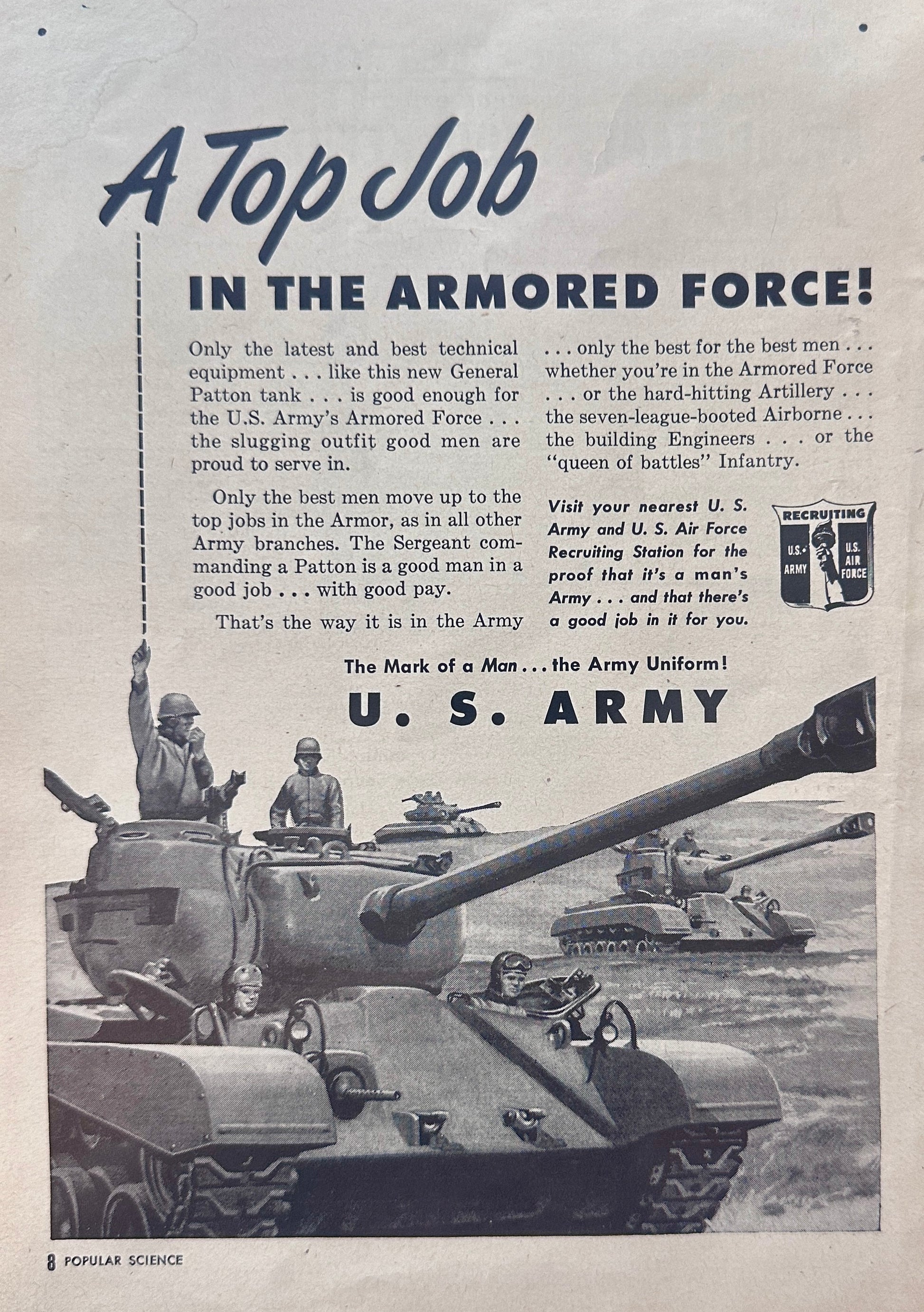 This original magazine ad measures 7 x 9" and showcases the US Army and the Tank Crews of 1951. The ad was part of their recruitment campaign that year, and the catchphrase The Mark of a Man ... The Army Uniform!