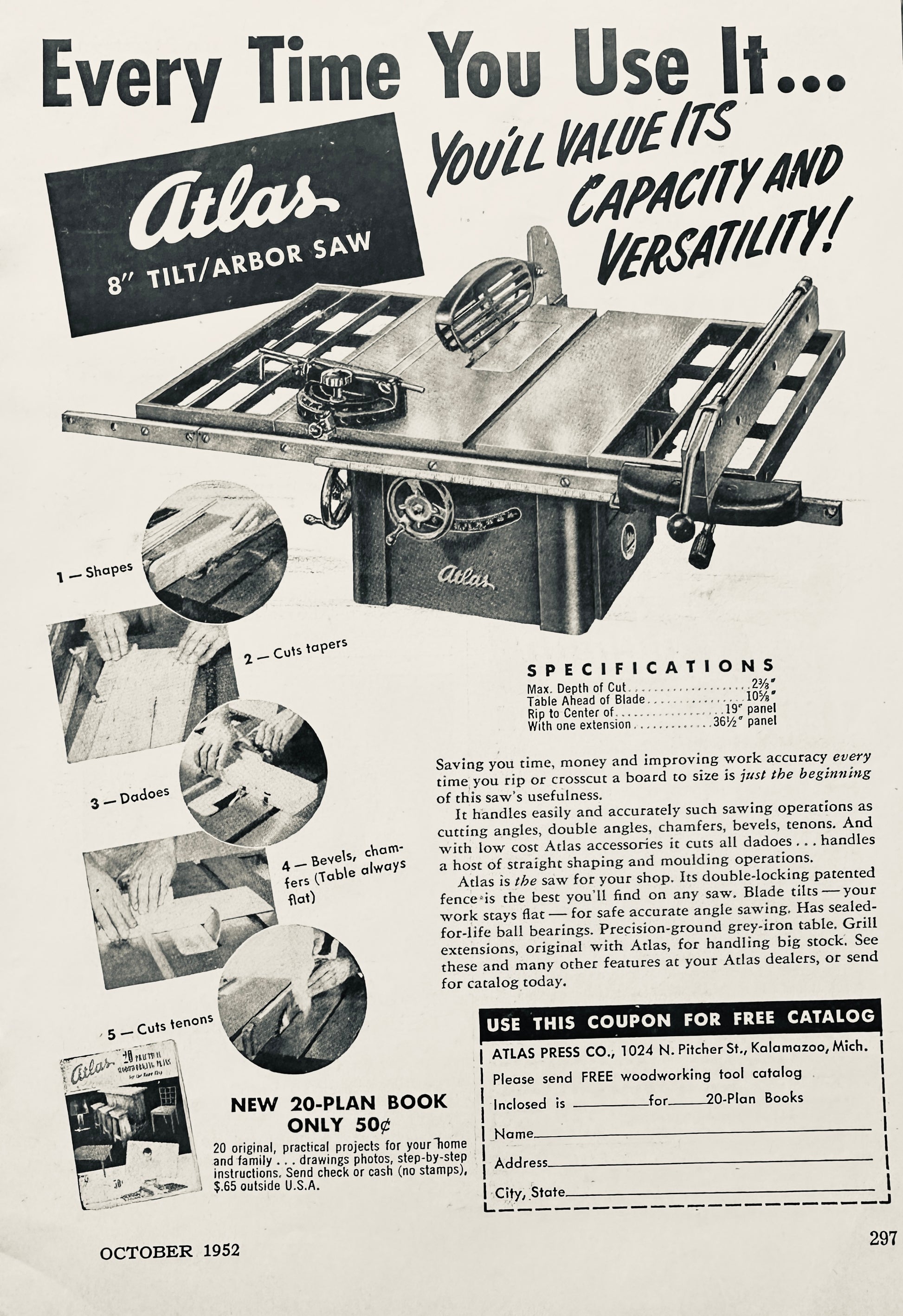This original 7 x 9" magazine ad from 1952 showcases the Atlas Tilt Arbor Saw claiming every time you use it you will value its capacity and versatility!